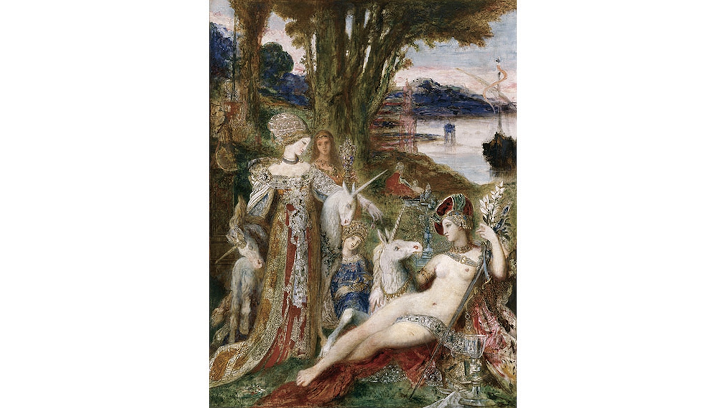 サロメが洗礼者ヨハネの首を求める場面を、稀有な発想と多様な建築・装飾様式を取り入れて描写した《出現》や、美しい女性が貞節の象徴とされる伝説上の動物を抱く《一角獣》など、神話や聖書をテーマにした作品で知られる象徴主義の巨匠、ギュスターヴ・モロー。産業の発展とともに、現実主義的、物質主義的な潮流にあった19世紀後半のフランスにおいてモローは、幻想的な内面世界を描くことで、真実を見出そうとした。