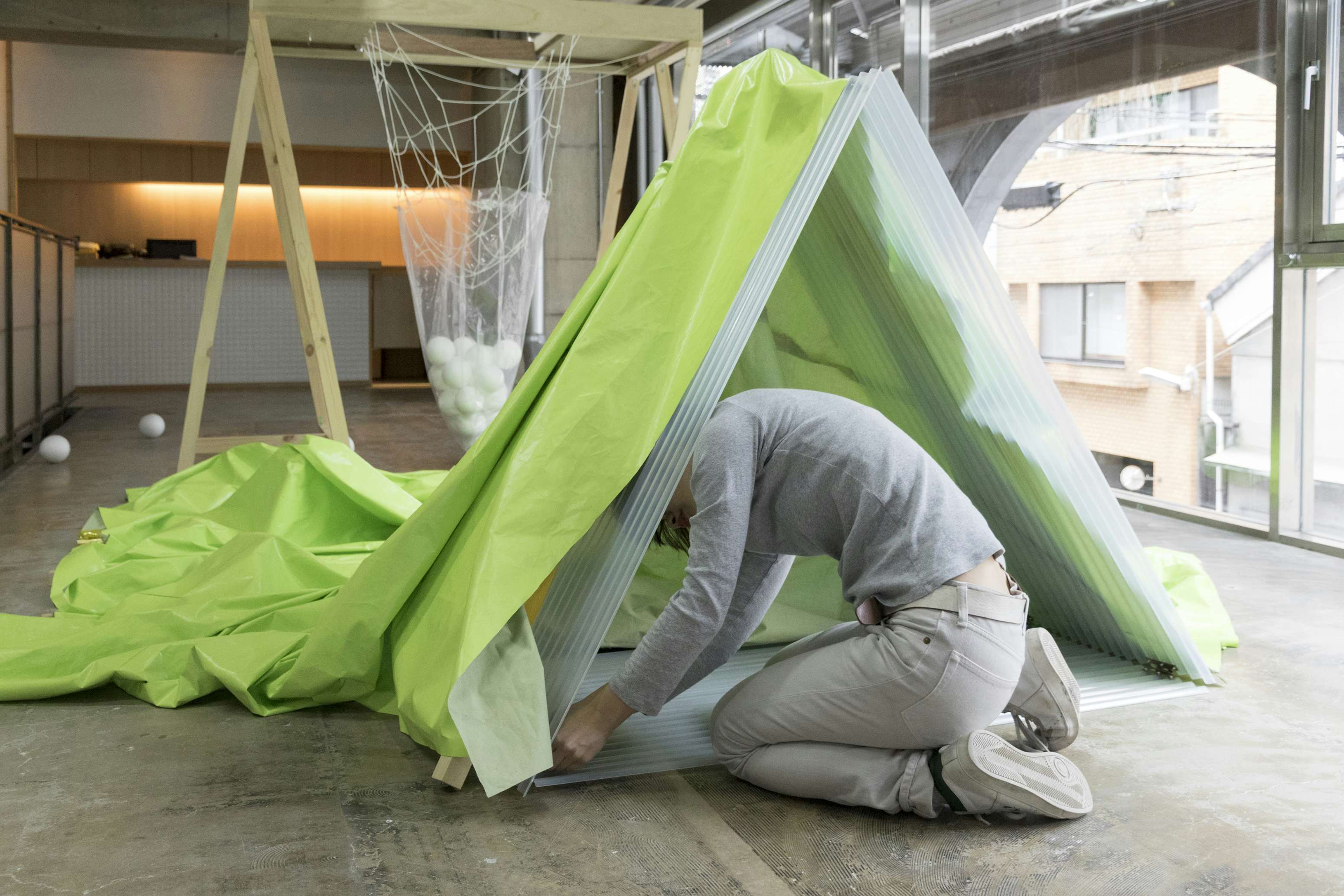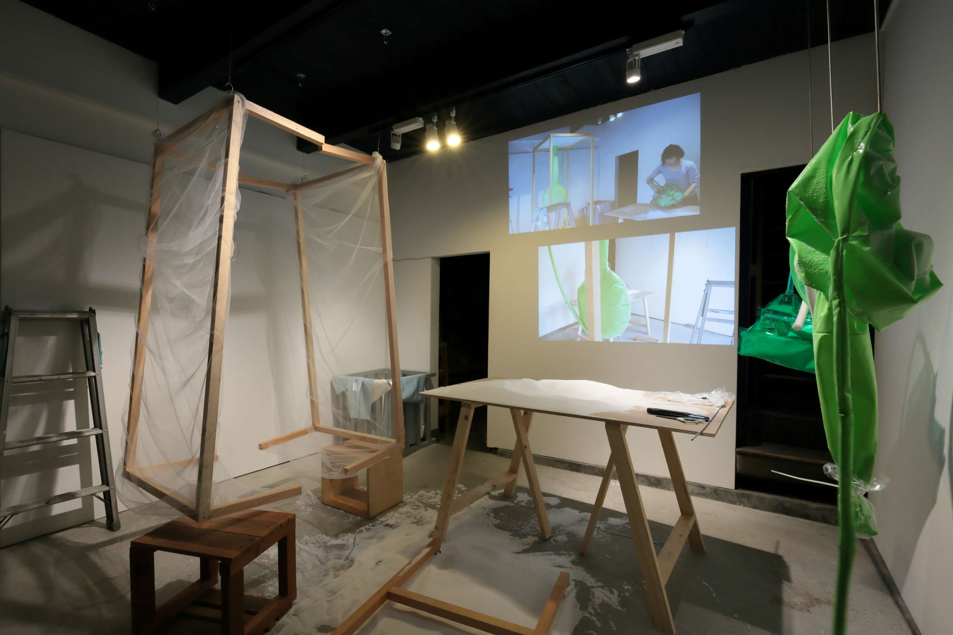 本展では、2人がこの小説にアプローチした新作を発表。川田は市内の、すでに元の用途として使われていない「履物屋」「小学校」「結婚式場」で滞在制作し、空間に漂う記憶をなぞった作品をA-Labで再構成する。いっぽう迎は、身近な社会の構造に対する自身の解釈を示す装置をつくり、自らの身体を使って動かす。
