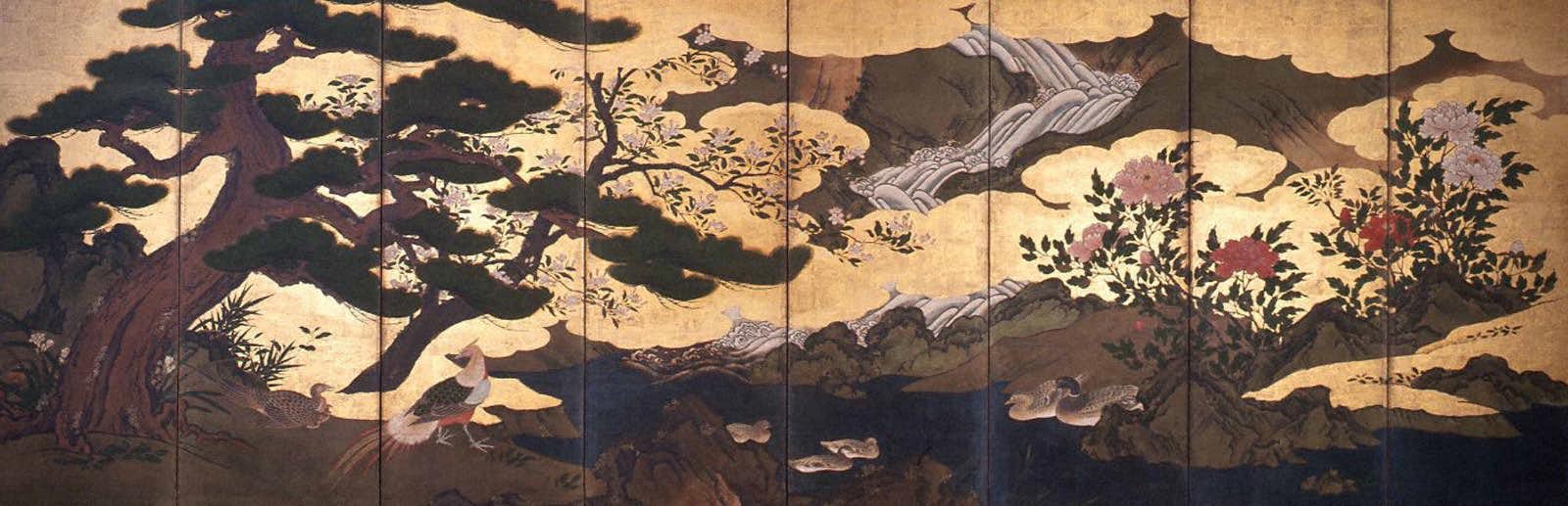 平安や鎌倉時代の古い屛風は、1扇ごとに、もしくは2扇ごとに縁取っていたのに対し、室町時代以降は屛風全体が一つにつながるように縁取りがなされ、大迫力な構図が金屛風の魅力をさらに引き立てた。