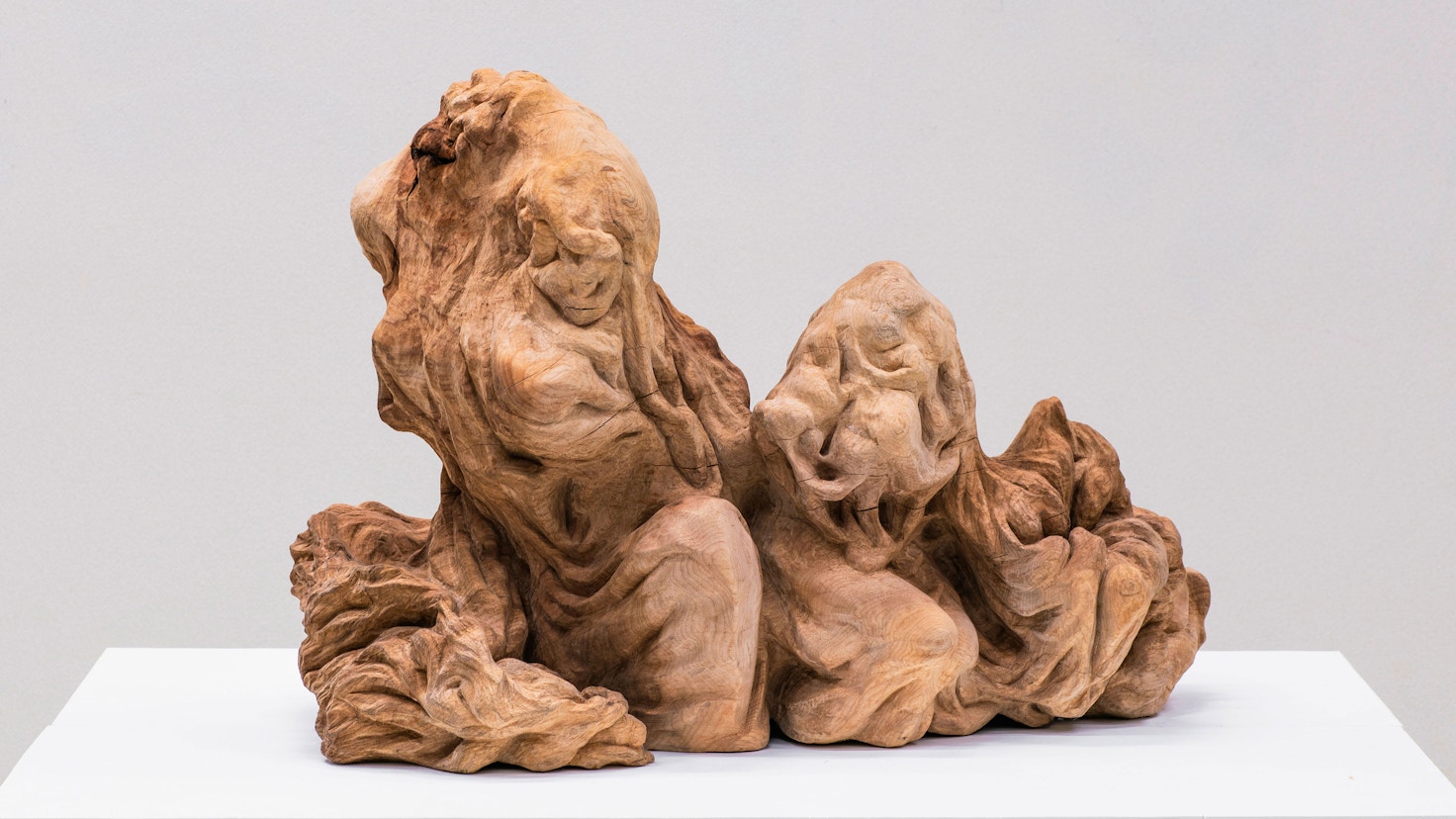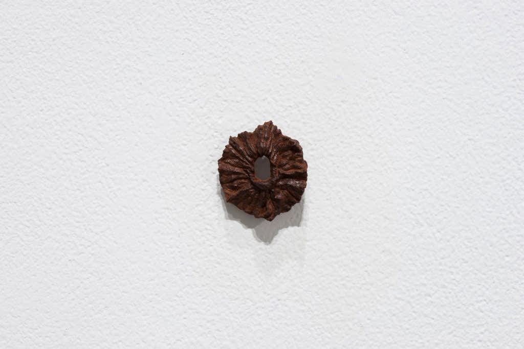 「rainbows edge」の制作において、極限まで枯れた野菜や果物の形状に、消えない虹を見たと言う七搦。その作品は、人間が触れることができない自然の領域に畏敬を示すと同時に、生き物の行く末の実像として直視させるような緊張感をあわせ持つ。一見不穏であるものの、木目やひび割れを生かした丁寧な彫りが素材の豊かさが感じさせる。