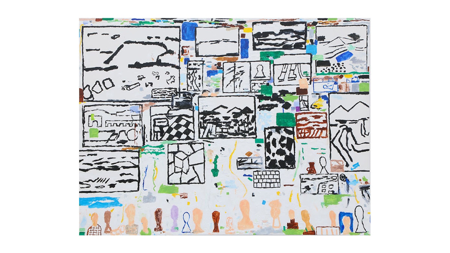 作品タイトルには、「風景」という言葉を多用する衣。その絵画には、山や畑、家並みや道など、記憶の片隅にあるような風景的要素が散りばめられている。それぞれのモチーフは、細部を省いた単色のかたまり、もしくは輪郭で表され、あるものは水平、いっぽうは垂直に描き込んで画面全体の視点が混在している。また、画面に繰り返し現れる「古墳」は、輪郭だけで誰もがそれと認識できるほど記号的であるが、衣の絵画においては、人の上半身のようにも見ることができる。