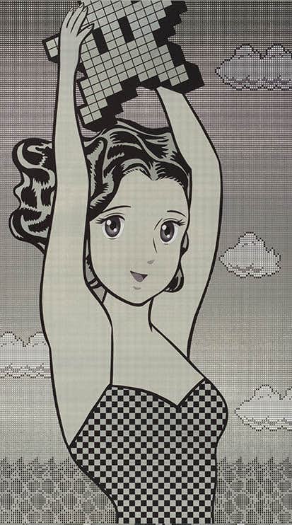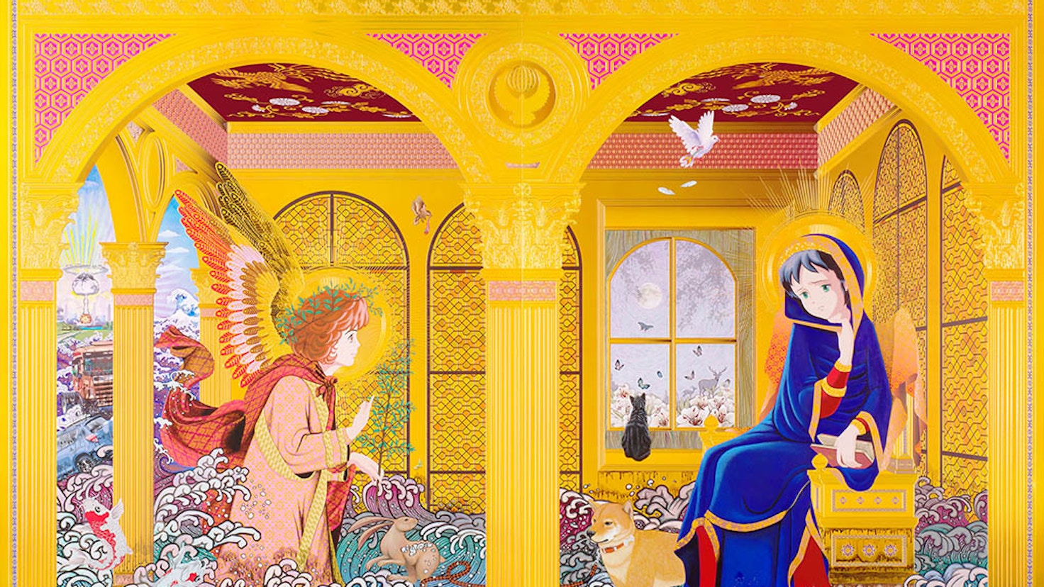 その当時興隆したアニメや漫画の同人文化にも触発され、名画とアニメそれぞれから借りたモチーフを画面に融合させるスタイルが誕生。宗教画に用いられた黄金テンペラ部分をUV印刷に置き換えるなど最新の技術を使っており、まるで超合金のおもちゃのようなその画面は、私たちにマンガ的脱力感をおぼえさせる。