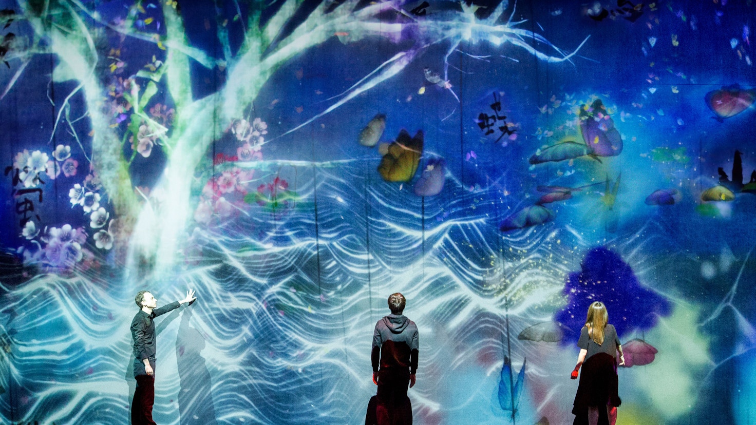《世界は暗闇からはじまるが、それでもやさしくうつくしい》は、人が近づくと漢字が創造され、周辺と影響し合う作品。《Black Waves: 埋もれ失いそして生まれる》は、連続してつながった波によるインスタレーションで、境界のない新しい関係を模索した作品。そして、《永遠の今の中で連続する生と死、コントロールできないけれども、共に生きる》は、複製ではない、リアルタイムな花の移り変わりを映し出す。