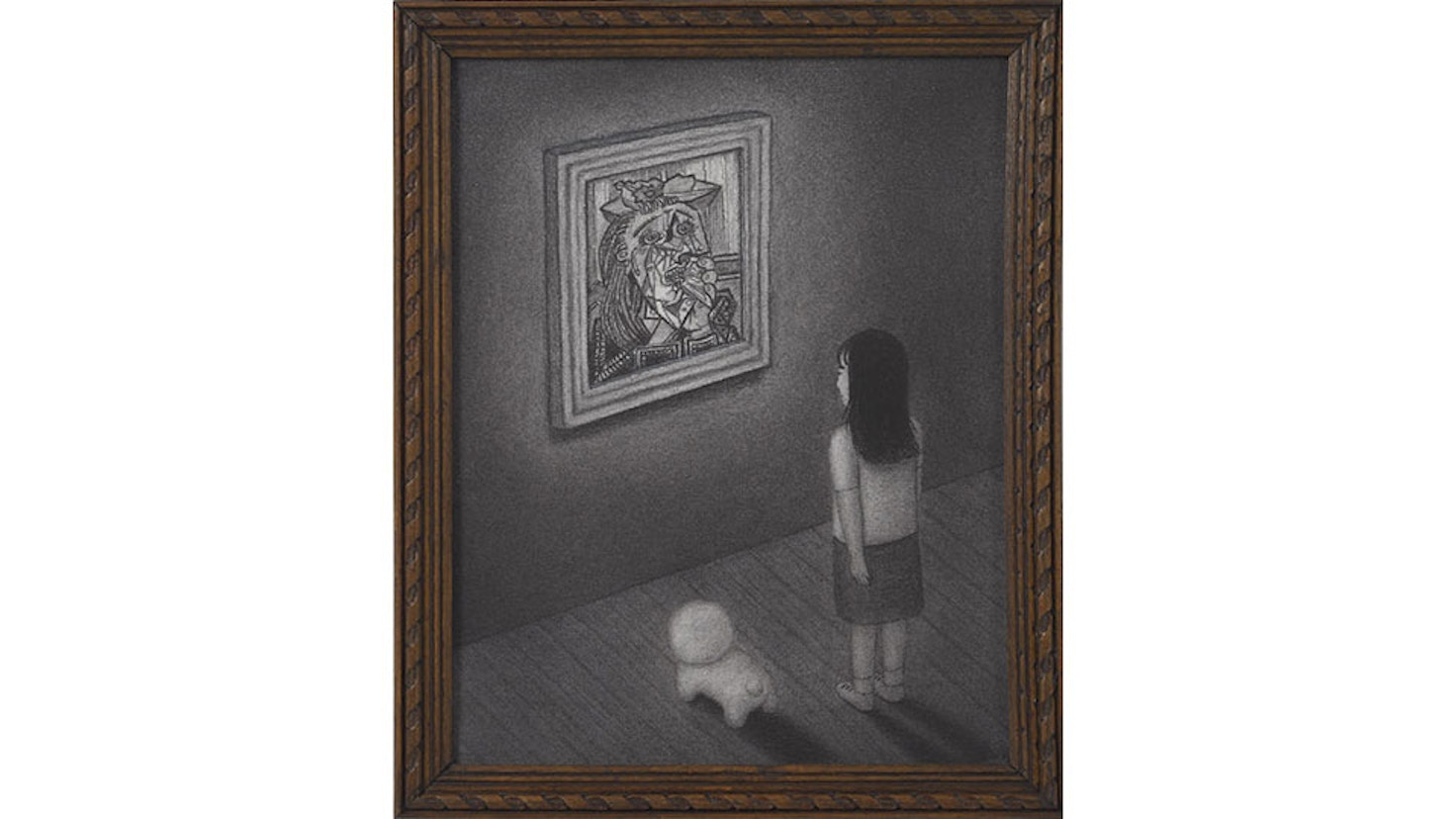 また、本展タイトルにもなっている木炭ドローイングのシリーズ作品《LOVEと私のメモリーズ》は、少女とラブという名の犬との思い出に基づく作品。人間好みに品種改良が進む犬が短命であるというニュースをきっかけに、愛犬へと向けられた「愛(LOVE)」について考察している。