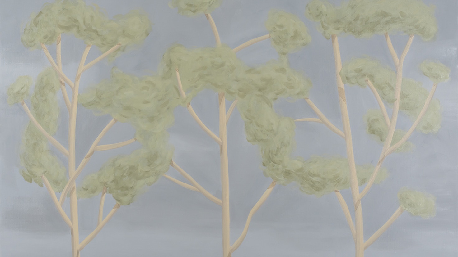 笹井青依は1986年神奈川生まれ、武蔵野美術大学大学院造形研究科美術専攻油絵コースを修了。ニュートラルなグレーの空間を背景に、デフォルメされた木々を描くペインターだ。