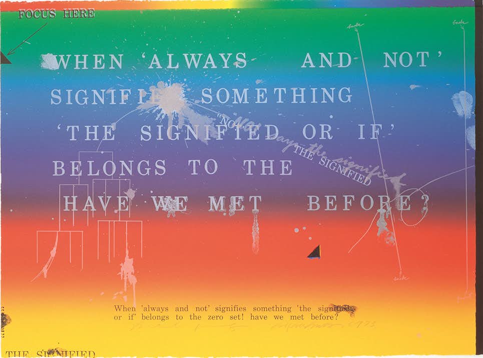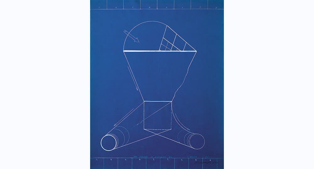 荒川修作は、ニューヨークを拠点として世界的に活躍した美術家。1950年代後半〜60年代にかけては、人間が本来持つ感覚を再認識する、また新しい考えや価値観を生み出す方法を模索。その研究を、詩人マドリン・ギンズとの共著『意味のメカニズム』(初版1971年)でまとめ、シルエットや矢印、色のグラデーションなどからなる絵画作品を通して発表した。