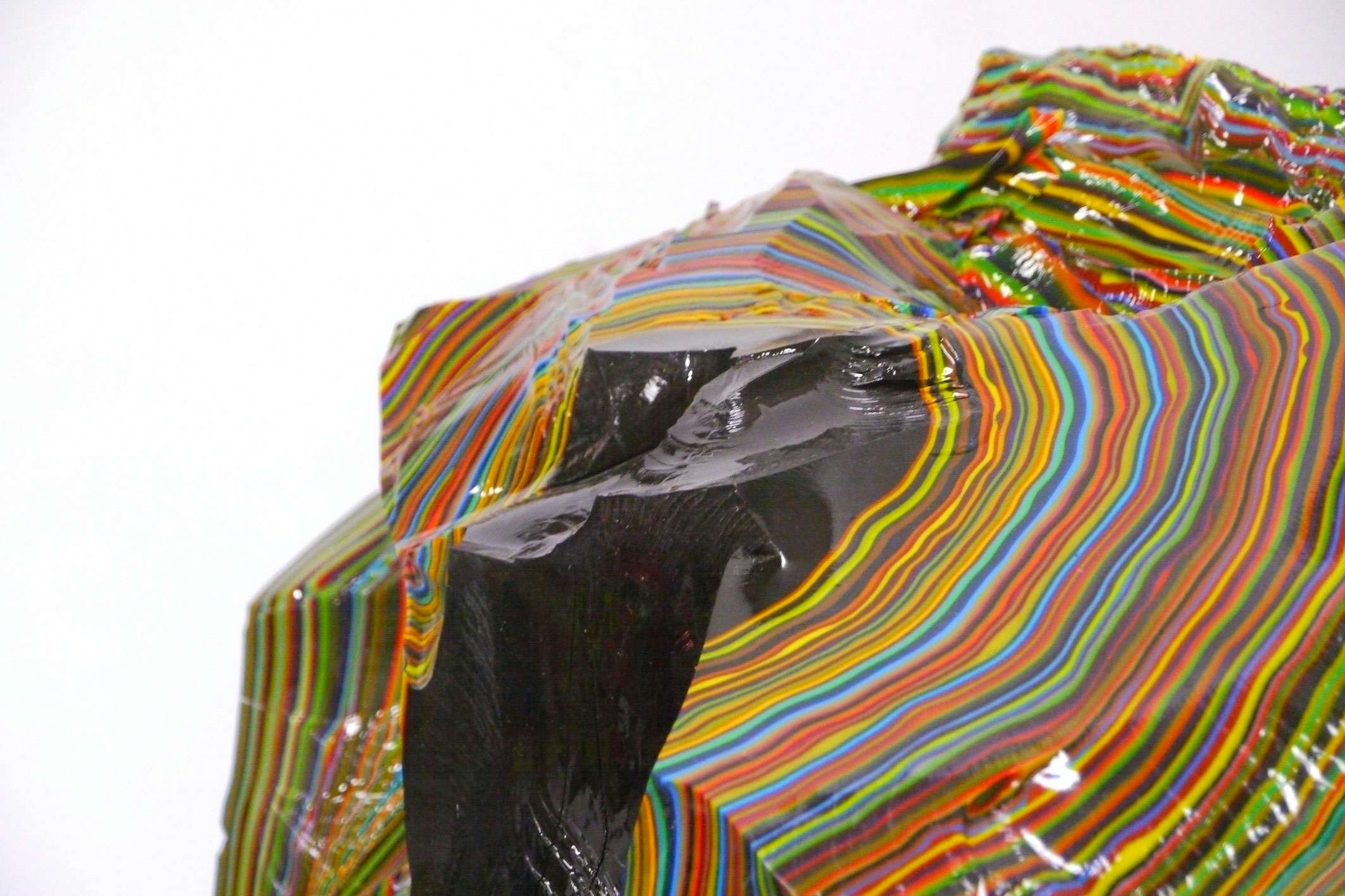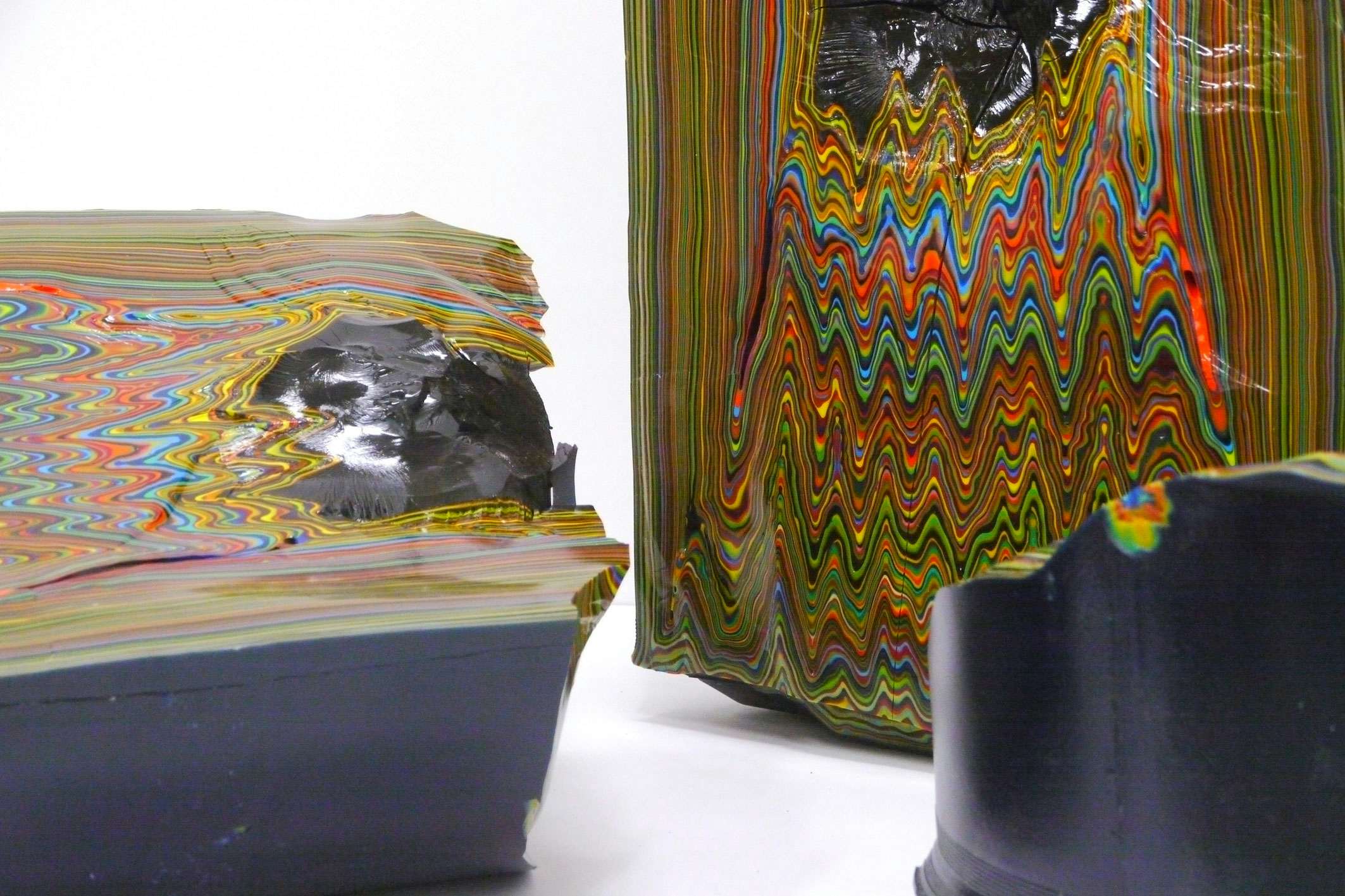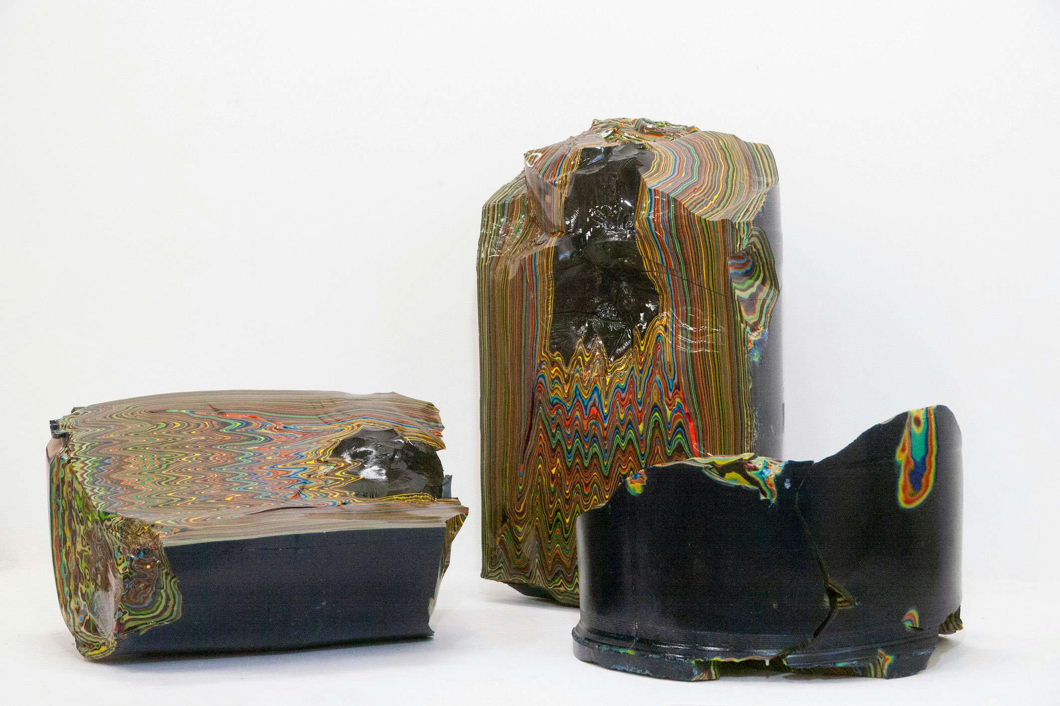 作品の素材には主にプラスチック製の日用品を使用。地殻変動をモチーフにした彫刻作品《Tectonics》では、プラスチックの内部に、様々な色相のポリエステル製樹脂を流し込み、攪拌、積層させた後、落下などの衝撃を与えて断面を露わにしている。
