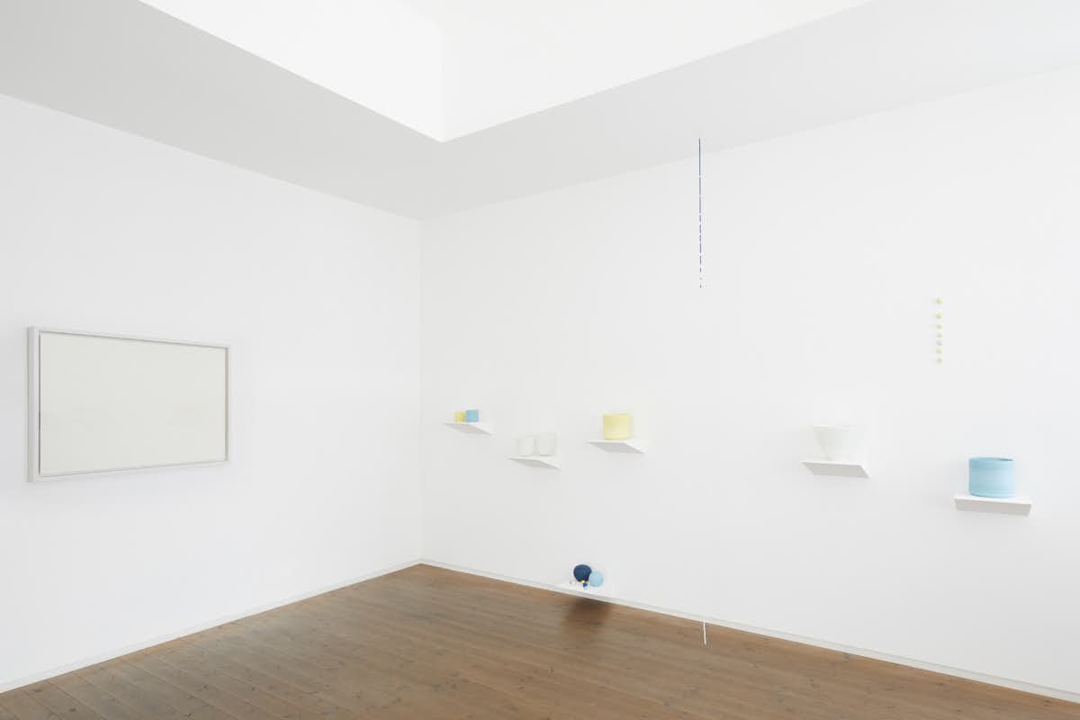 本展は「光」というテーマのもと、陶磁器と絵画という異なる素材による作品を組み合わせ、光と作品との関係性を探る試み。新里の代表シリーズ「光器」に白とは異なる色を追加した新作と、田幡が白い紙に白いペンで描いたドローイング作品を展示する。