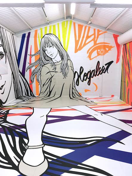 現代社会の「オンナノコ」をシンプルな太い線でポップに描いてきたアーティスト・Hogalee(ホガリー)。2013年頃より、美術史に登場する絵画とコミック的人物像とを合体させた「剽窃」シリーズと、マスキングテープを画材の代用にして巨大な壁画を描く「原状回復」シリーズという異なるテーマに取り組んでいる。