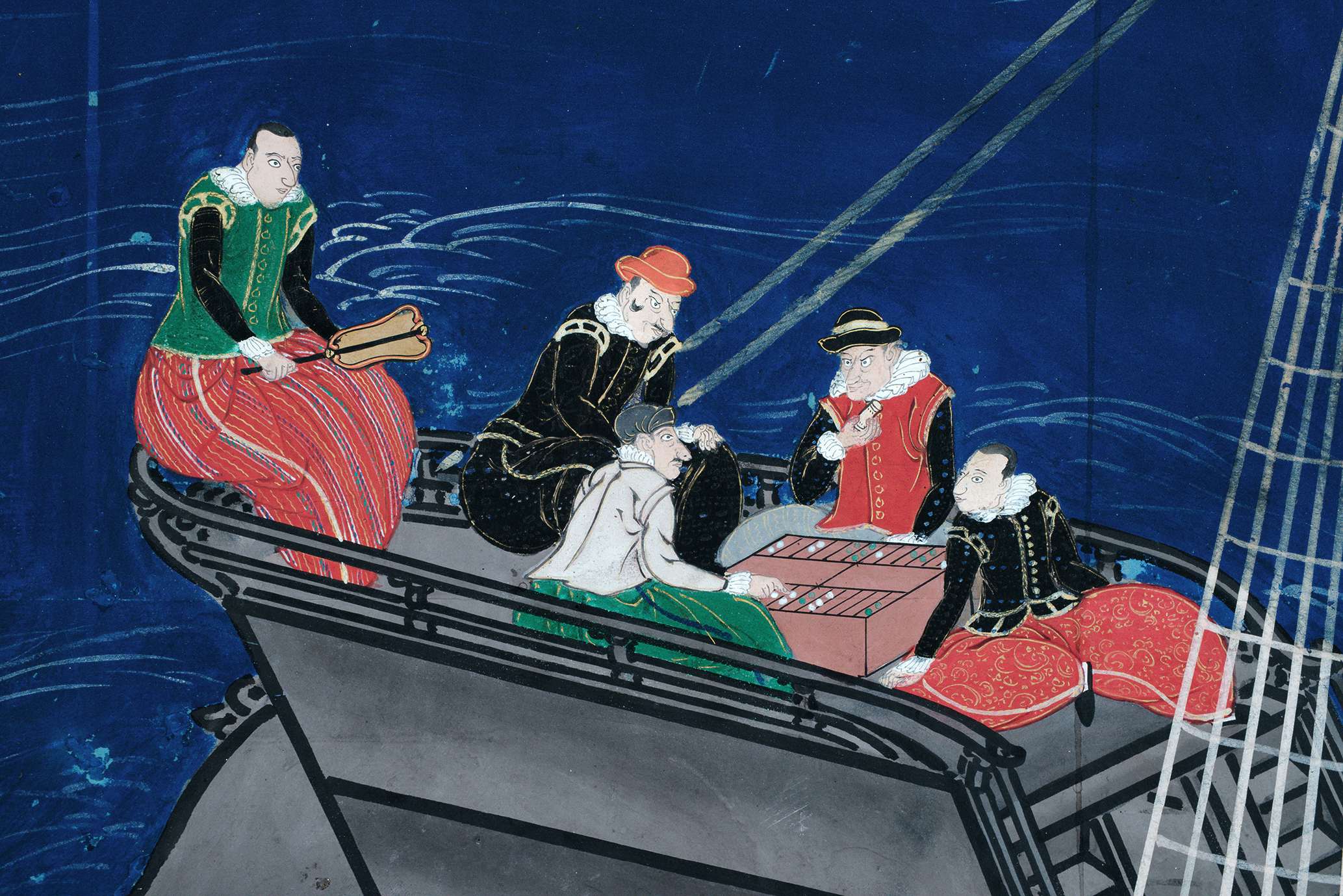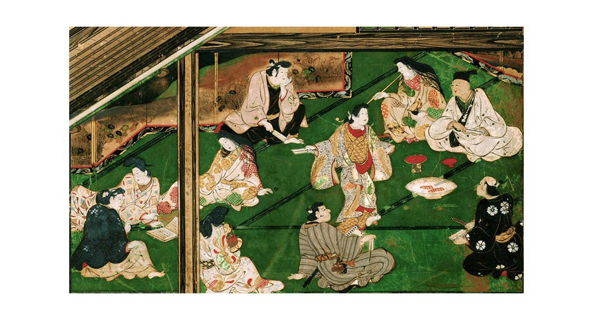 中世以降には、中国の士君子の嗜みとして奨励された「琴棋書画(琴・囲碁・書道・絵画の意)」の影響を受けて、「琴棋書画図」を主題とした屛風や襖絵が盛行。近世に入ると、花見や風流踊りに興じる開放的な気分にあふれた「野外遊楽図」が流行し、江戸時代前期には幕藩体制が安定に向かうとともに、室内で親密に遊ぶ様子を描く「邸内遊楽図」に中心が移った。
