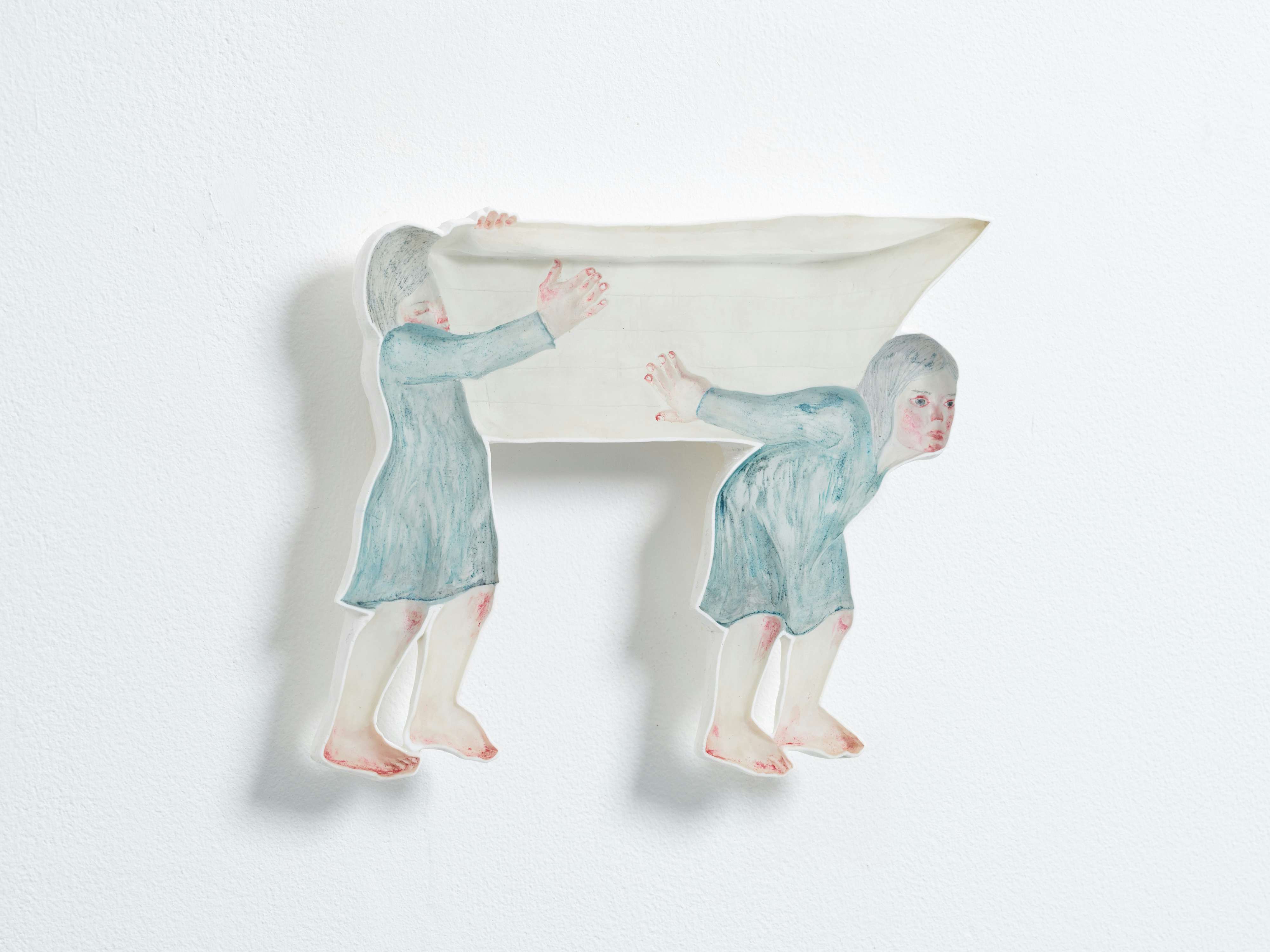 中谷が手がける平面的なレリーフ作品は、制作方法も独創的。まず粘土で半立体像をつくり、それを石膏で型取りしてから始められる。完成した石膏型(雌型[めがた]、凹んだかたちの型)に透明もしくは着色した樹脂を流し込み、表面を仕上げる。この工程を踏んで、凸(最初の粘土の像)から凹(途中の石膏型)、そして最後はフラットな表面へ、立体と平面の間を行き来しながら作品がかたちづくられる。