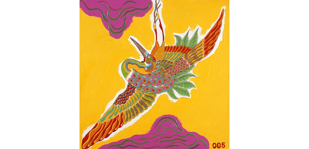 松や鶴といった吉祥のモチーフと、それらを取り巻く不穏な色彩と構図といった相反するものが混在する田名網の作品は、戦時中に作家の脳裏に焼き付いた残酷なイメージとその異様な美しさを、膨大な記憶の集積によって再構築させる試みともいえる。