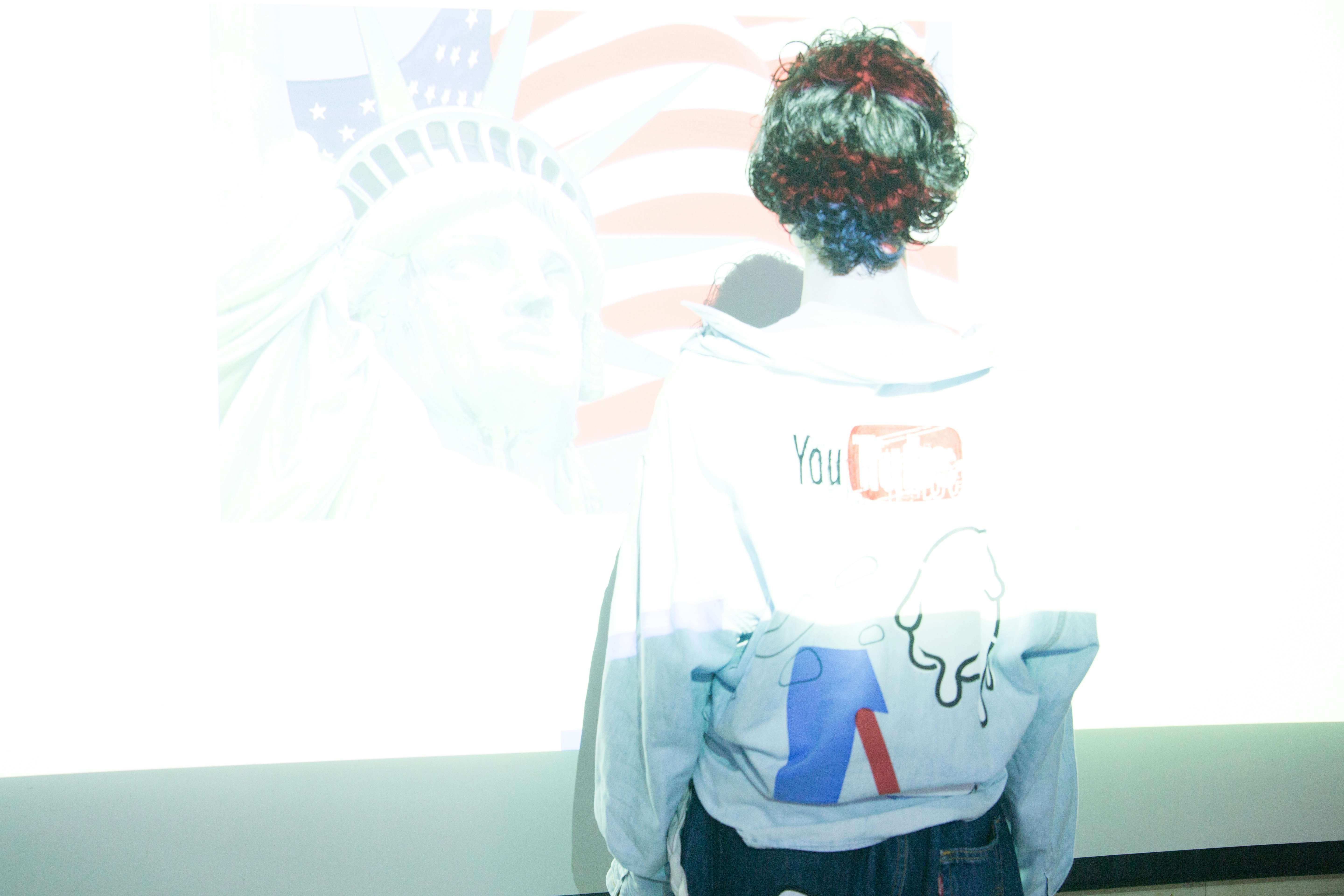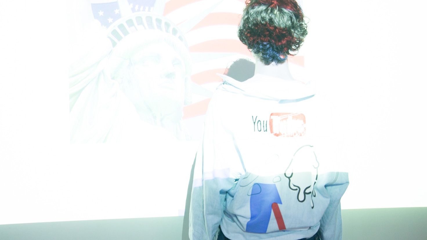本展では「AMERICA」をテーマに、飛田によるシルクスクリーンプリントとNukemeによるグリッチ刺繍が施された、古着のデニムアイテムを展示・販売。2人が思い描く「AMERICA」をかたちにした作品は、すべて1点ものとなる。