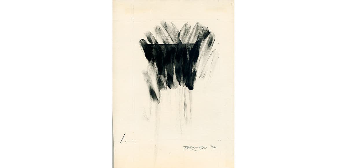高松は1970年、そのキャリアのなかでも重要なシリーズ「影」「遠近法」「単体」を発表後、「こすり」を含む多くのドローイングを制作。「こすり」においては、紙に黒い幾何形態を描き、指などを使ってこすることで、純粋形態に破調やノイズが介在する画面をつくり出した。