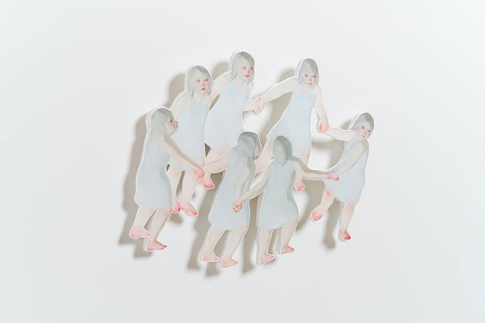 まず粘土原型の型をとり、その凹面状の雌型に透明樹脂を流し込んだ半立体のレリーフ作品を数多く手がける中谷。モチーフが盛り上がる一般的なレリーフとは異なり、凹凸が反転した作品は柔らかく、あいまいで、中立的な気配を漂わせると同時に、くぼんだ空虚が実在するように見える不思議な雰囲気を持つ。