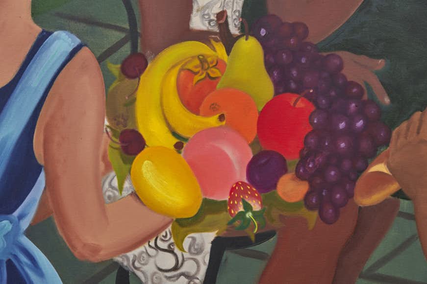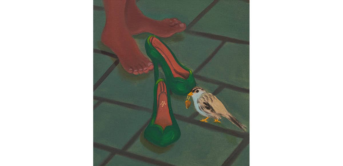 ファーラが描くのは、日常で何気なく目にした場面や記憶の断片から構築される新たな情景。通りのパン屋を覗く女性、窓越しの庭、鏡台に散らばる化粧品といった一瞬を具体的に切り取りながら、作品全体はとらえどころのない浮遊感と広がりを感じさせる。