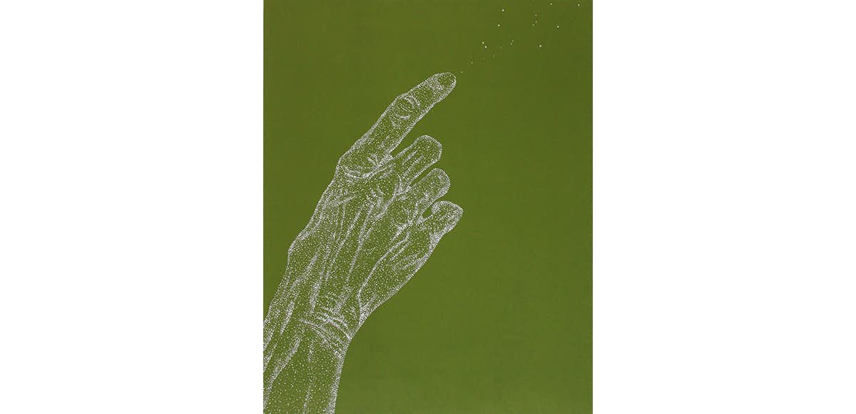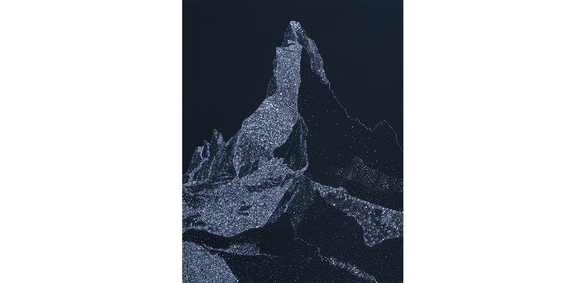 本展では、パートナーであり今年3月に逝去したアーティスト・佐藤雅晴への看病を続ける生活のなかで取り組んだ、平面シリーズ「immortal moment」の新作を発表。本作は、いまだ訪れたことのないマッターホルン、年老いた女性の手など、大垣が憧れを抱いているモチーフを、増殖する粒子をイメージした無数の点によって描いている。
