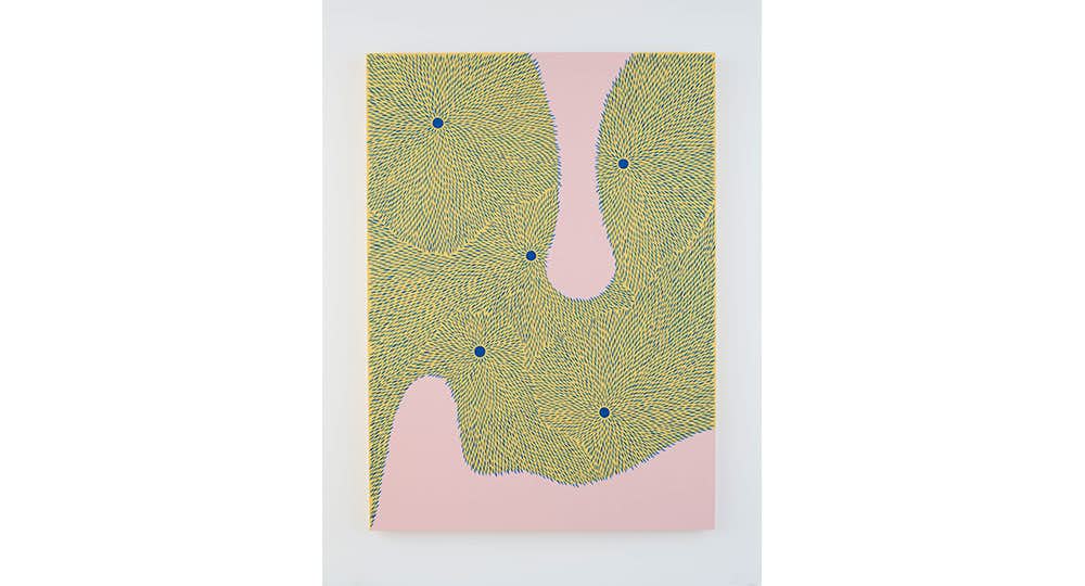 機械的な規則性を手作業で再現をするという、高度な集中力と忍耐力を要する過程を踏んだ作品群。生物の紋様や地図、エネルギーの流れを表した図、あるいは、宇宙空間や胎内に宿る生命、女性の身体性のメタファーとしての抽象画を思わせ、規則性がありながら、自然界の法則に従って生み出された均衡を感じさせる。