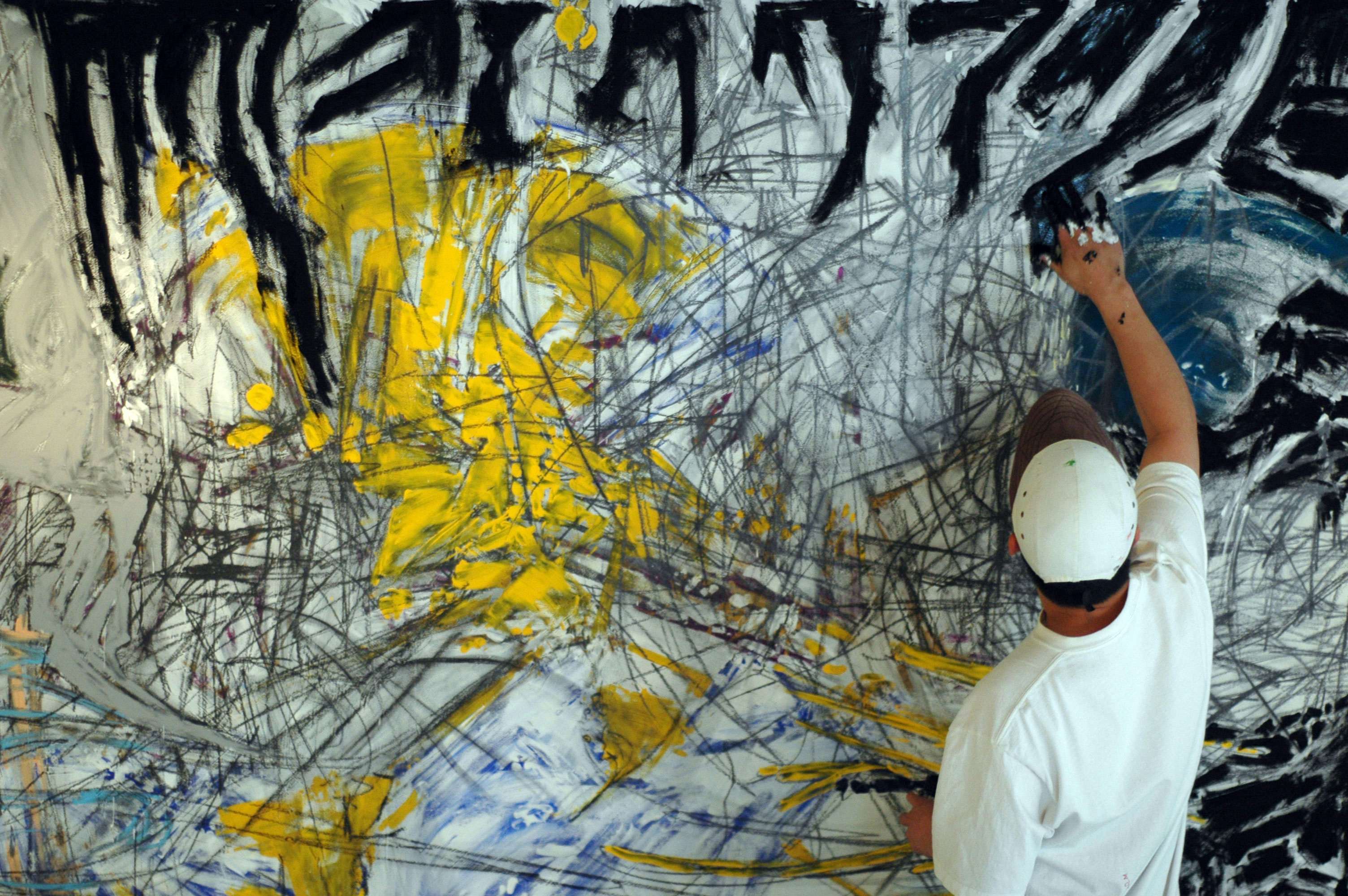 松岡亮は、素手や素足、ミシンを使って、言葉で表現できない感情やイメージを即興的に描くアーティスト。ヨウジヤマモトらデザイナーとのコラボレーション、書籍の表紙画制作、国内外での個展開催など幅広く活動している。