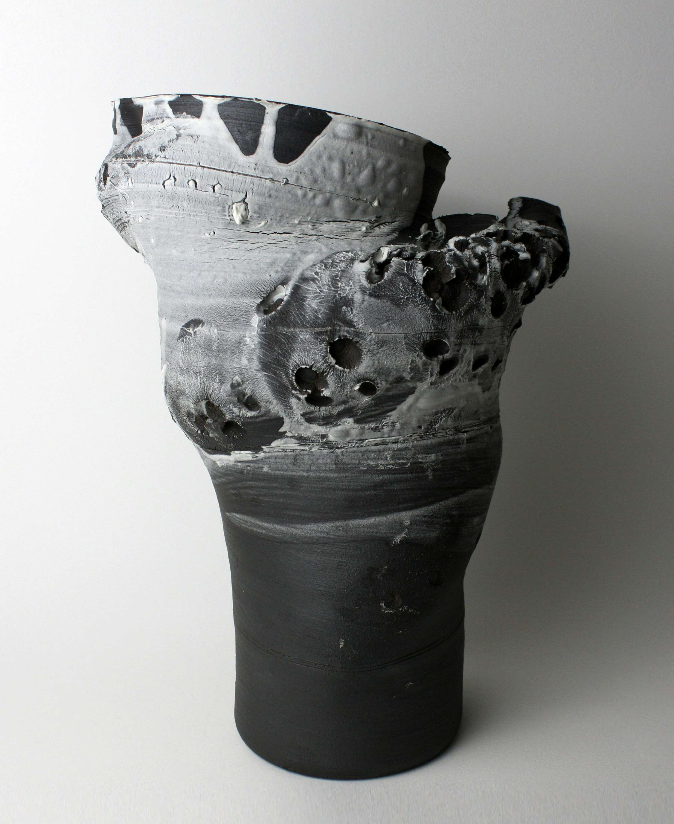 日常から取り残され見捨てられてしまったようなものモチーフに、伝統的な日用品としての陶芸から離れた自由な造形と、木の皮や岩肌、金属のような質感、水面に広がる様子を思わせる色の滲みを持つ陶器を制作する野田敏明。