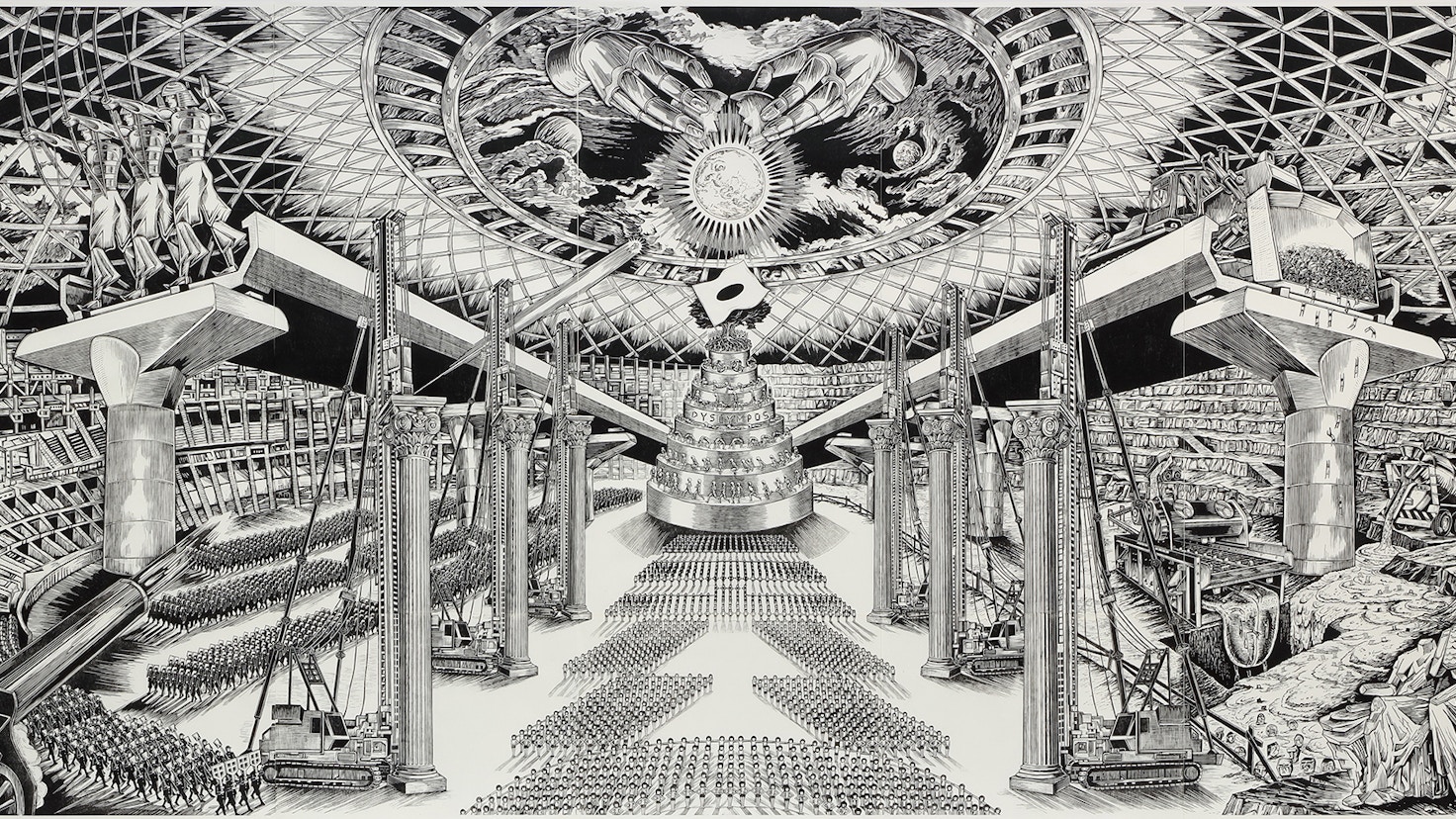 本展では、コンクリートをめぐる開発史を軸として、黒部ダム、立山信仰、戦争遺跡などでのリサーチを通した新作を発表する。新作のひとつ《クロベゴルト》は、ワーグナーの楽劇『ニーベルングの指輪』4部作の「序夜」にあたる『ラインの黄金(ラインゴルト)』の物語と、黒部峡谷の発展史を重ねた壮大な6点組みの作品だ。