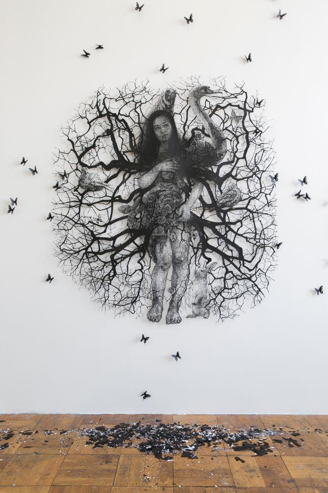 解剖学に興味を持ち、人間の身体と動植物の形態が相似するところから、人間と動植物が一体化するイメージを描写、超絶技巧の切り絵で表現する盛田。2016年の初個展より「名画の中の身体」を主題とした作品を手がけ始めた。