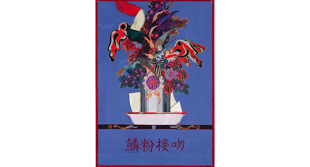 本展では、植物をモチーフに擬人化や花言葉に意味を重ねるなどした、華やかで意味深い作品約20点が展示されている。