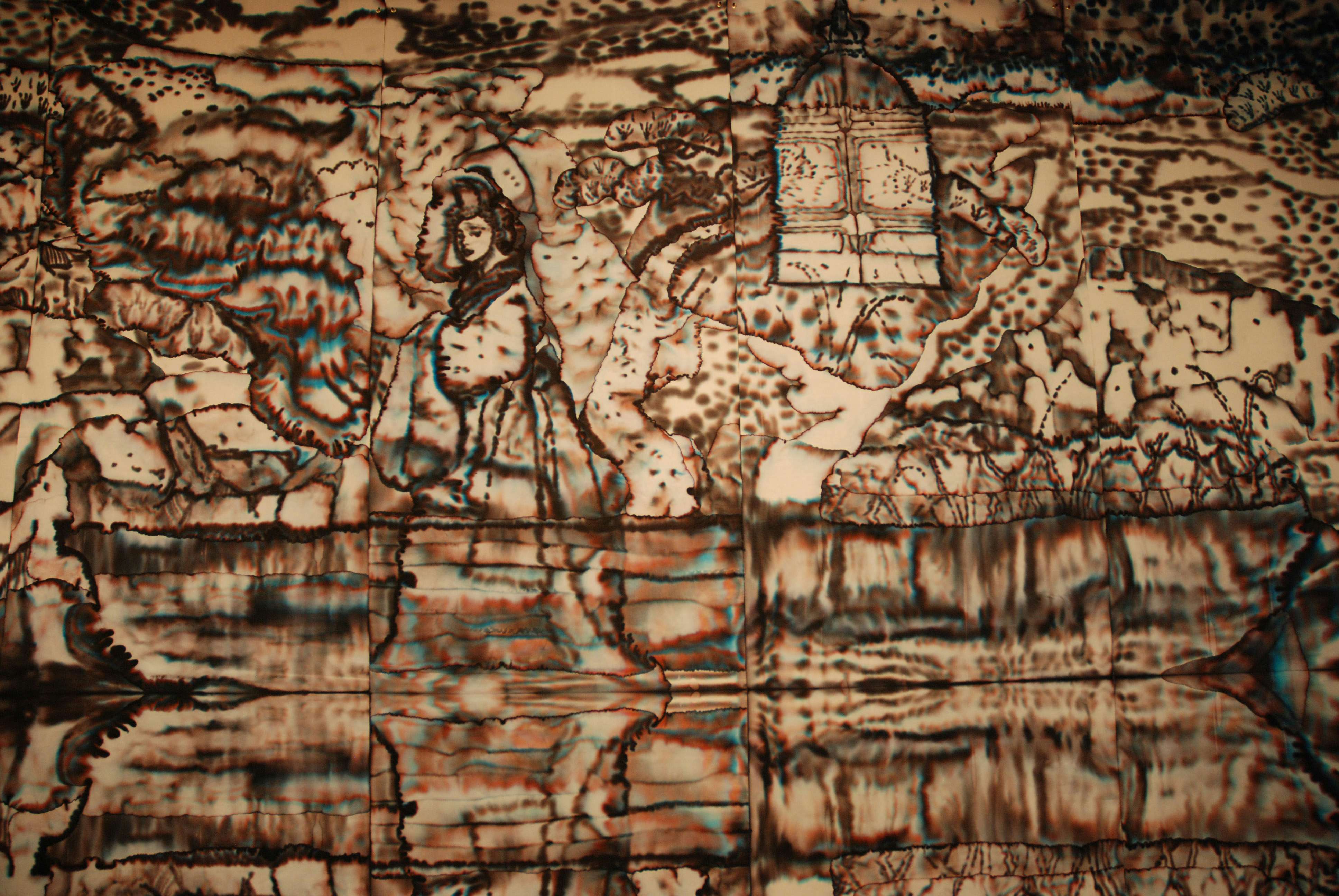 本展では、滲み広がる染料や油絵具で独自のイメージをつくり上げる黒宮が、倉敷市真備町に疎開した小説家・横溝正史の作品世界に分け入って制作した新作を展示する。