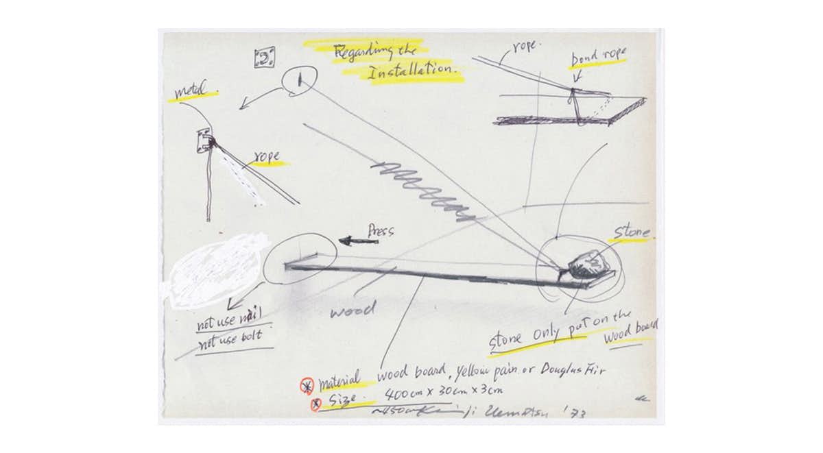 本展は、植松が73年に発表した、石、板、ロープが精密なバランスで均衡するインスタレーション作品を、作家自身の手により再制作するもの。インスタレーションのほか、ドローイングや写真などもあわせて展示し、初期の植松の根幹となる思考を伝えると同時に、見えない「もの」や「時間」に対する一貫した関心のもとに持続してきた活動を振り返る。