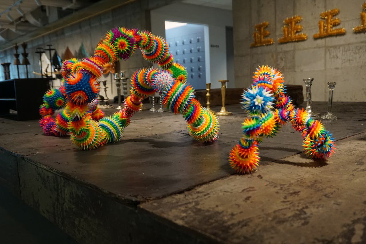 本展では、人工物と自然物、世界に散らばるガラクタを集め、融合させた作品群で、森羅万象が渦巻く空間を出現させる。