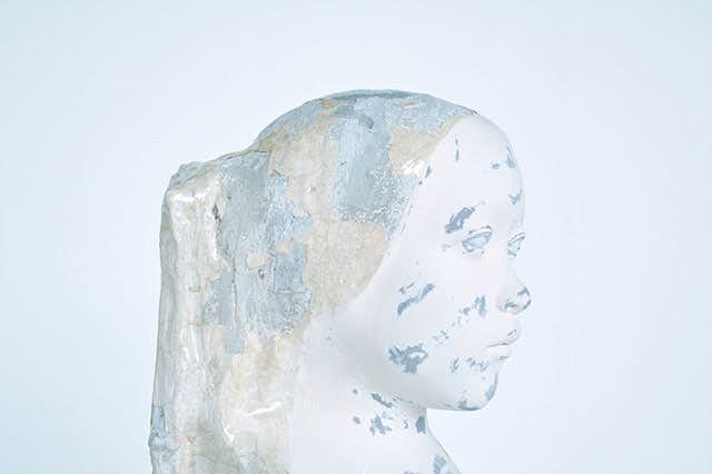 上半身は物語性を排除するように腕から手の部位が削ぎ落とされ、性別や年齢も意識させない抽象的な人体のフォルムは、完成に向かっている途中にある。あるいは、完成形から崩れていく過程でもあり、そのどちらでもありどちらでもない、境界に佇む肖像として立ち現れる。