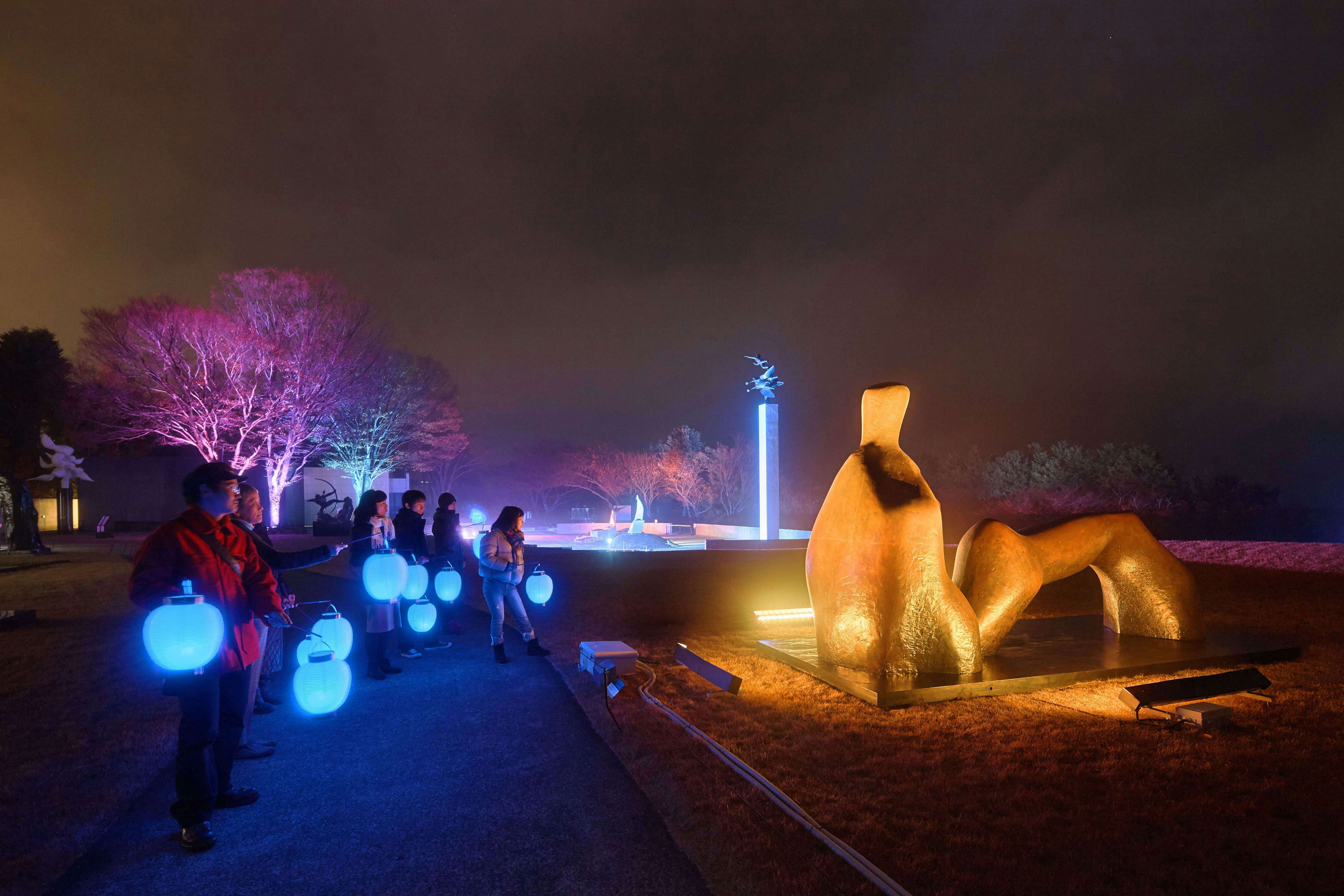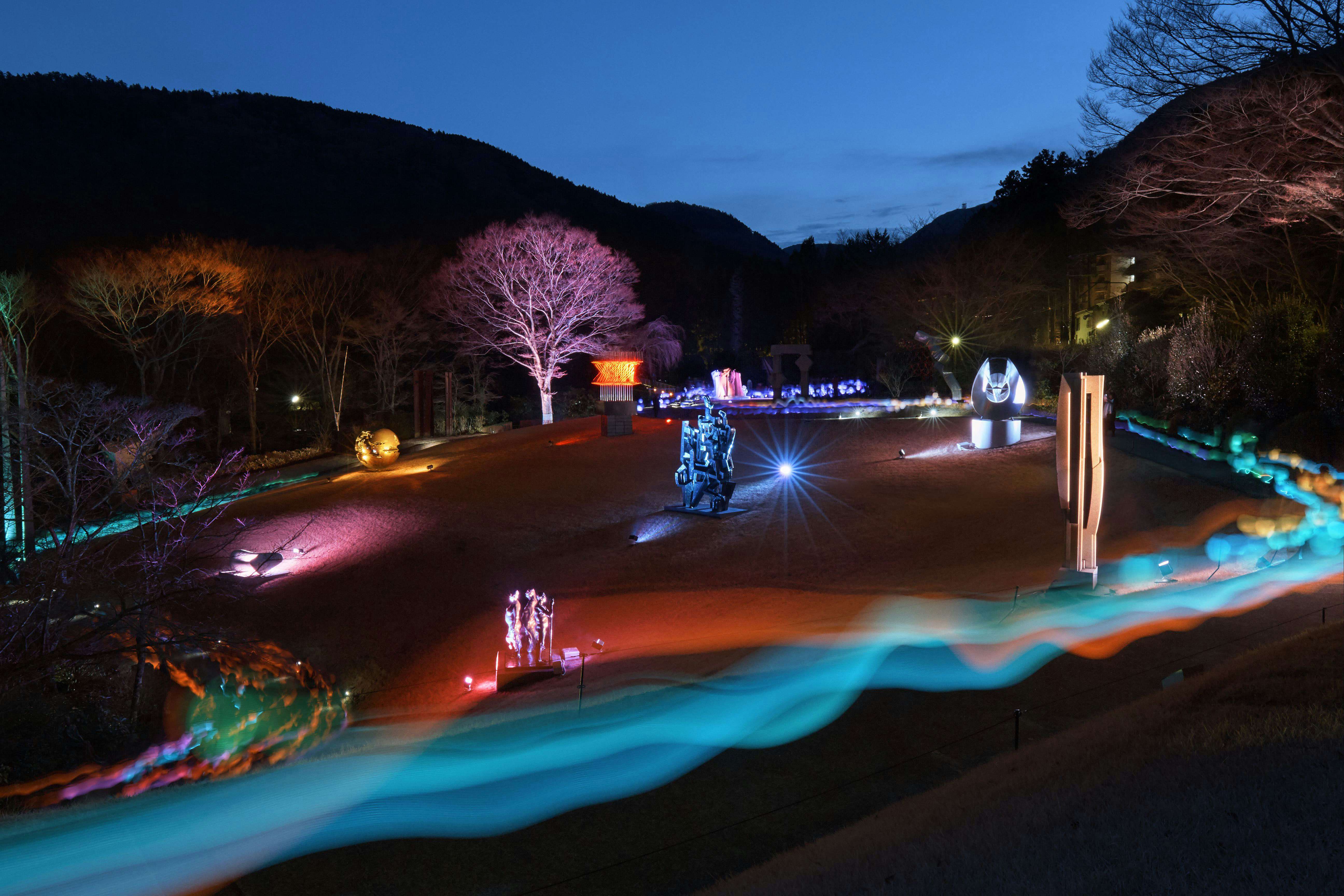 クリスマスから新年にかけて彫刻の森美術館で開催される、アーティスト・髙橋匡太のライトアップイベント「箱根ナイトミュージアム」。本イベントは、美術館の野外彫刻のライトアップに呼応して色を変える提灯を手に、夜の彫刻庭園を巡り、光でドローイングするかのように、参加者一人ひとりがつくり出す不可思議な夜景を楽しむことができる。