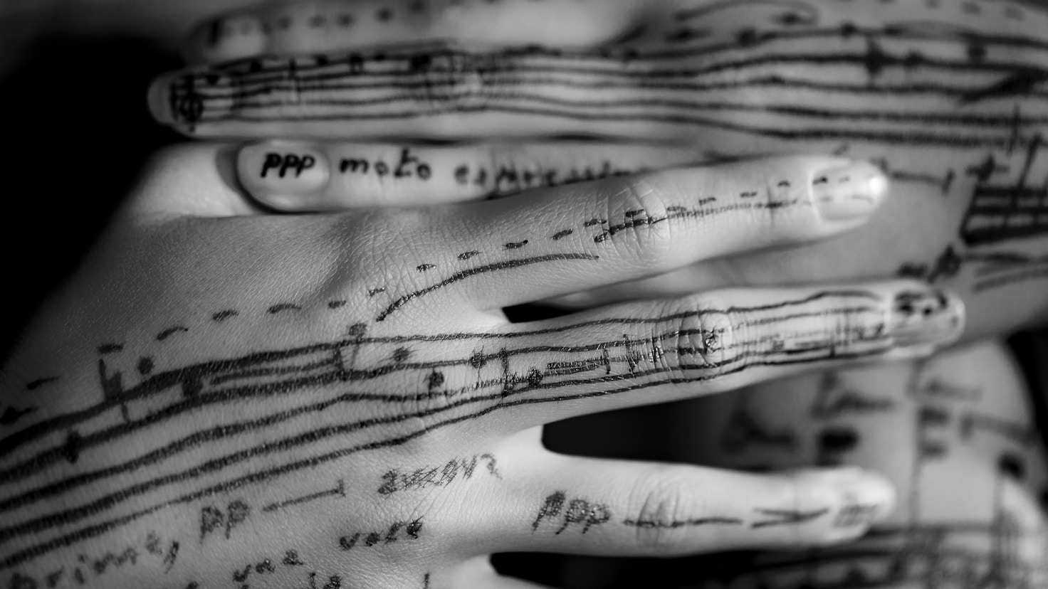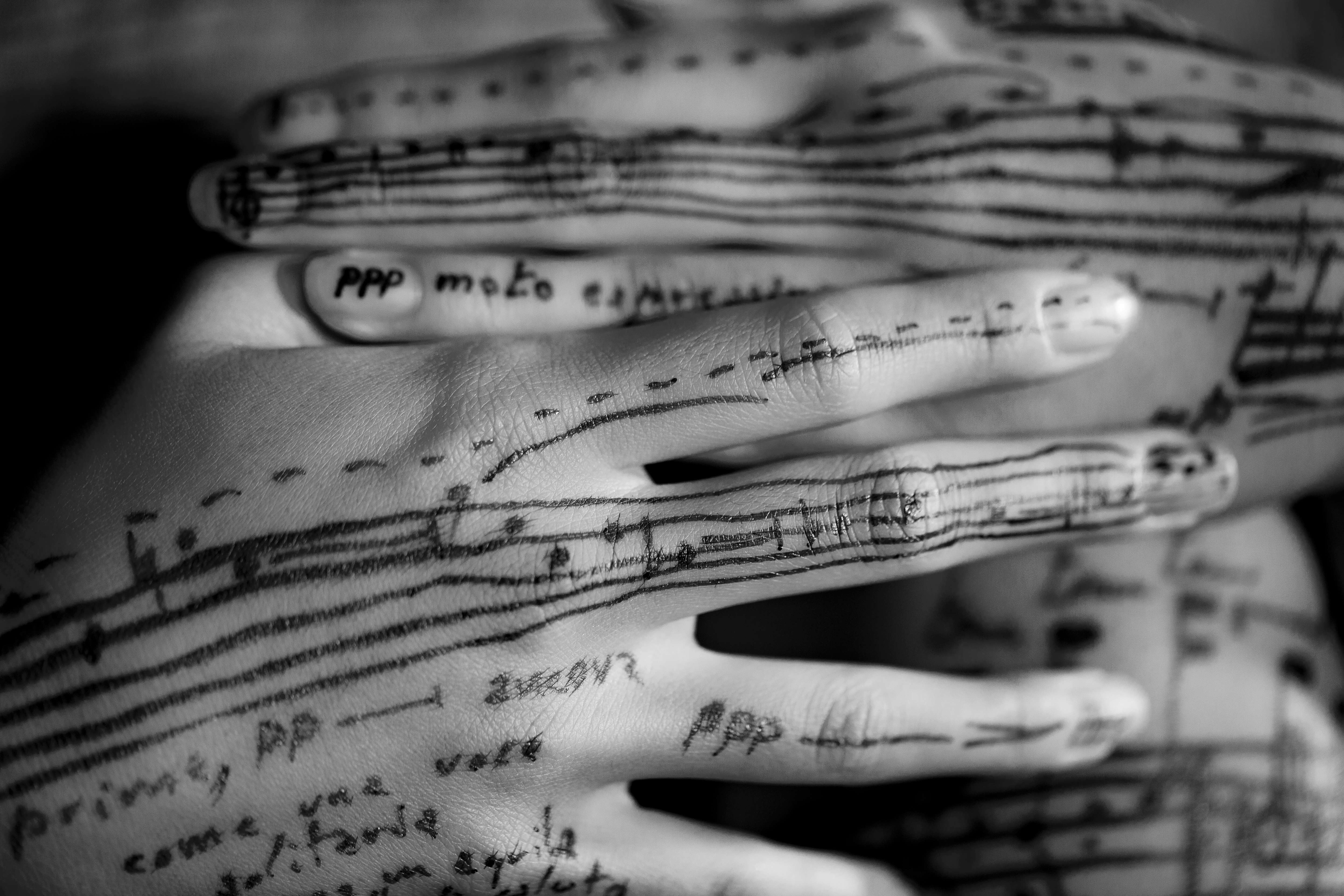 バボーニ・スキリンジによる「Bodyscore」は、人間の皮膚に直接、手書きで楽譜を書き、楽譜が描かれた身体を様々なポージングで撮影。それぞれの写真には、作家が瞬間的に行った芸術的選択と作家の意識が刻み込まれており、一連の写真は作家の言葉で「IDENTIGRAPHIES(アイデンティグラフィ)」と呼ばれる。