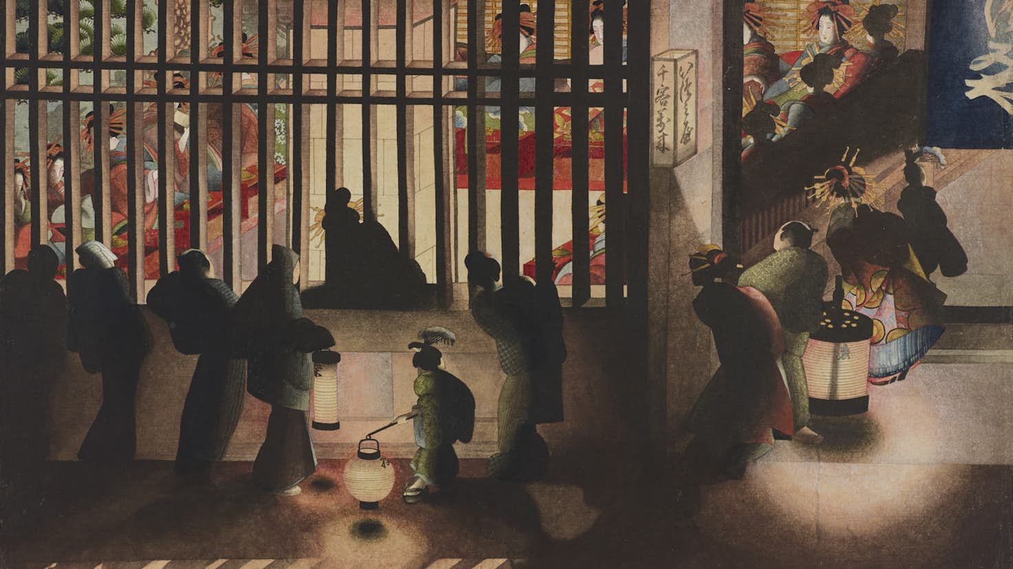 応為の希少な作品のひとつである《吉原格子先之図》は本展が約2年ぶりの公開。光と影の大胆な描写で江戸の遊郭・吉原の夜を描き出し、暗闇のなかに人々の姿が浮かび上がる幻想的な作品となっている。