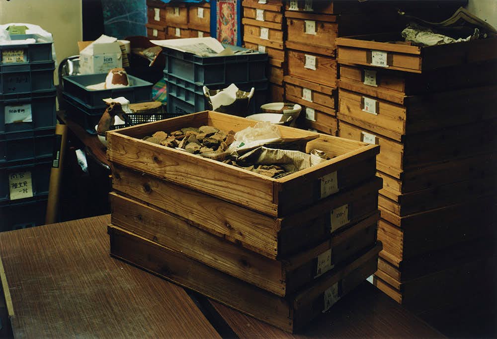 同シリーズは、新潟県津南町を皮切りに、各地の博物館の収蔵庫や発掘現場で保管されていた大量の縄文土器のかけらと、それらを収めていた箱の中敷きや梱包として使用された新聞を、保管状態そのままに撮影したもの。文様が施された土器のかけらを前に、田附は「何も語らないピースが現代に生きる自分たちに語るものがあり、歴史・過去が炙り出される」と言う。