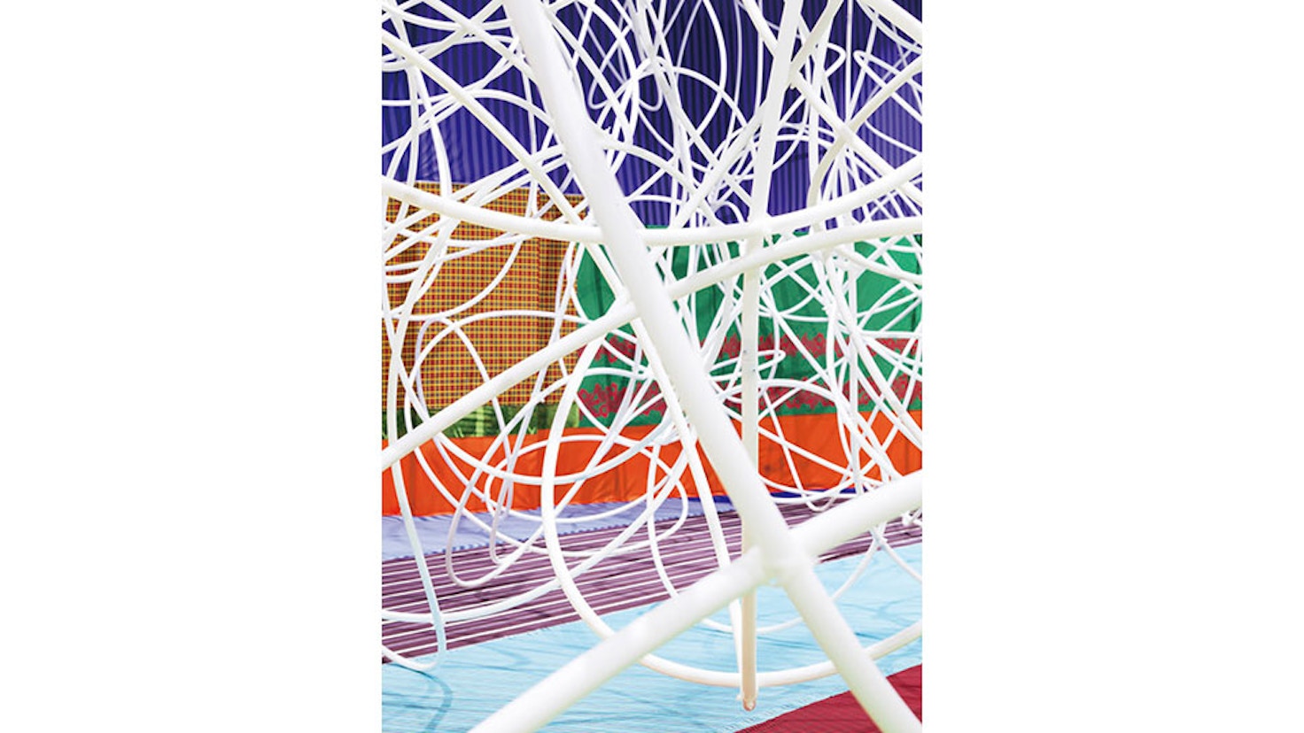 フラフープや糸などの既製品からなる大規模インスタレーション作品を手がけてきたアーティスト・鬼頭健吾の個展が開催されている。
