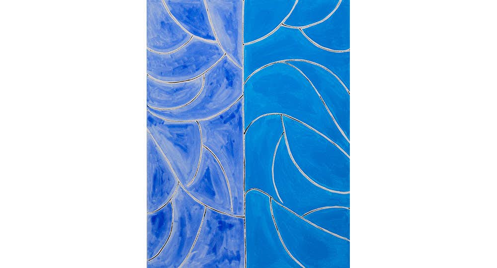 バトラーの風景画は、題材となる木の枝や幹が単純化され、縦や斜線、三角、曲線といった幾何学模様のように、画面全体に余白なくリズミカルに反復して描かれるのが特徴。それらはコントラストの明瞭な色彩によって引き立たされ、具象と抽象の境界を模索するような独特な画面をつくり出している。