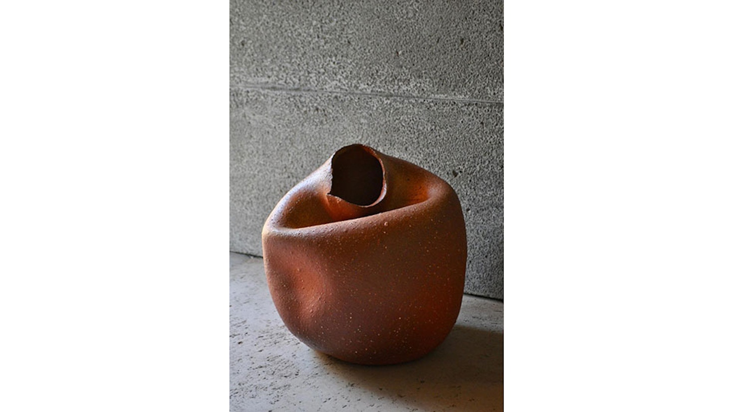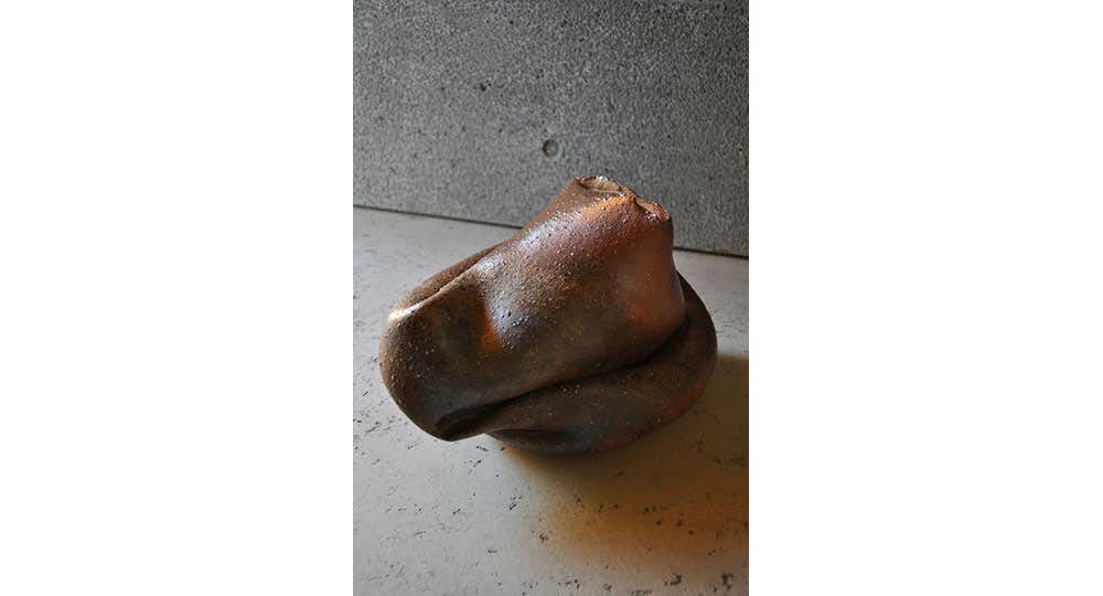 本展では、高さ約40センチの楕円形の壷形を変形させた「孕(よう)」シリーズを中心に6点を展示。首が傾いたもの、顎を引いたようなもの、肩が出っ張り、腰や腹が膨らみ曲がったりしたものなど、同シリーズの独特の造形は、見る者に多様な思念を促す豊饒なイメージを有している。