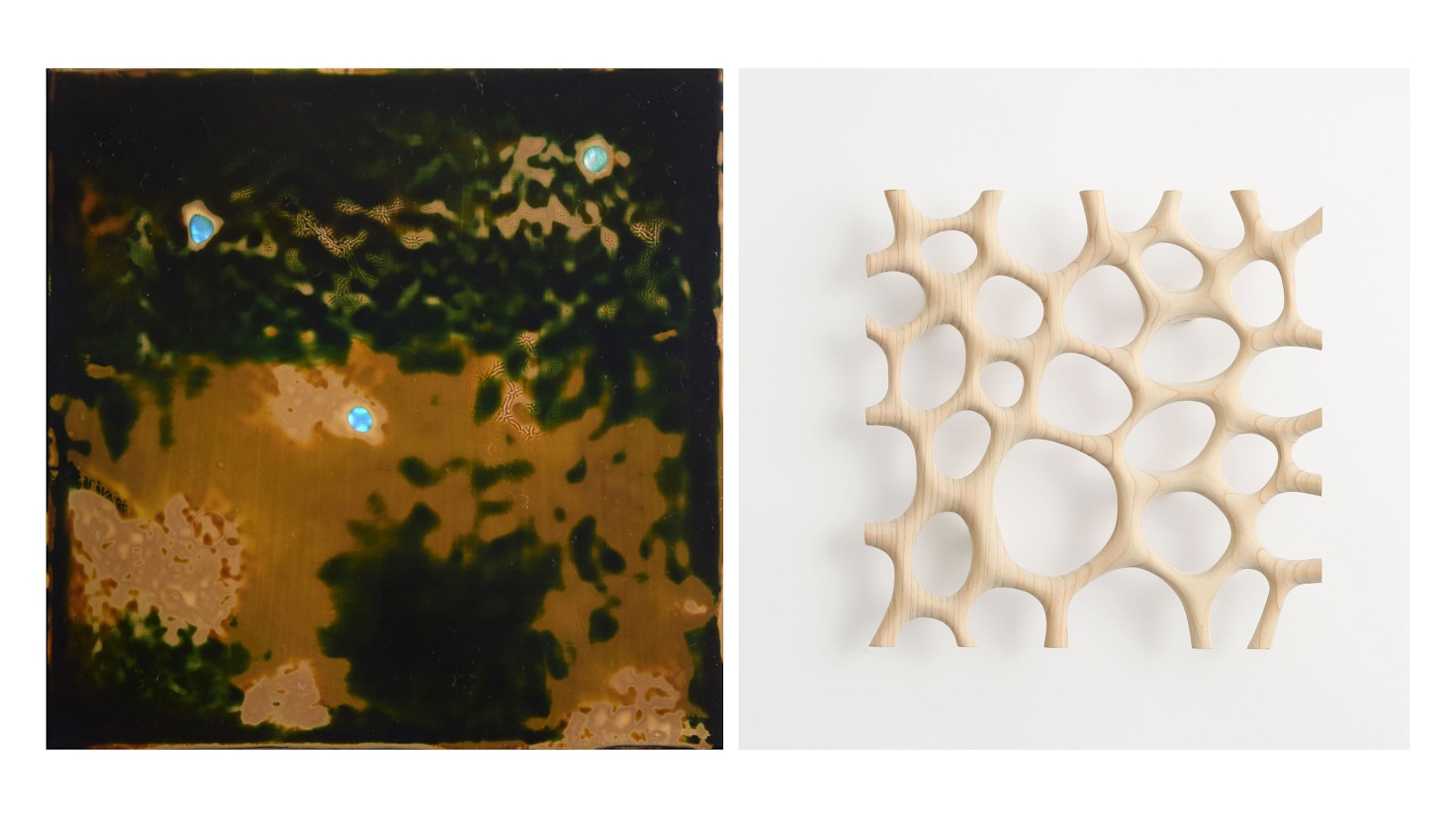 漆の伝統的な加飾技法により主に平面作品を制作する森山に対し、木工技術をベースに立体作品を手がける山西。本展では、まったく異なる技法や作風を持ちつつも、不思議と調和するふたりの作品を、アーティストの天牛美矢子(てんぎゅう・みやこ、同大学大学院美術研究科工芸専攻染織修了者)の詩と構成により並べることで現れる、「森」の景色の展示を試みる。