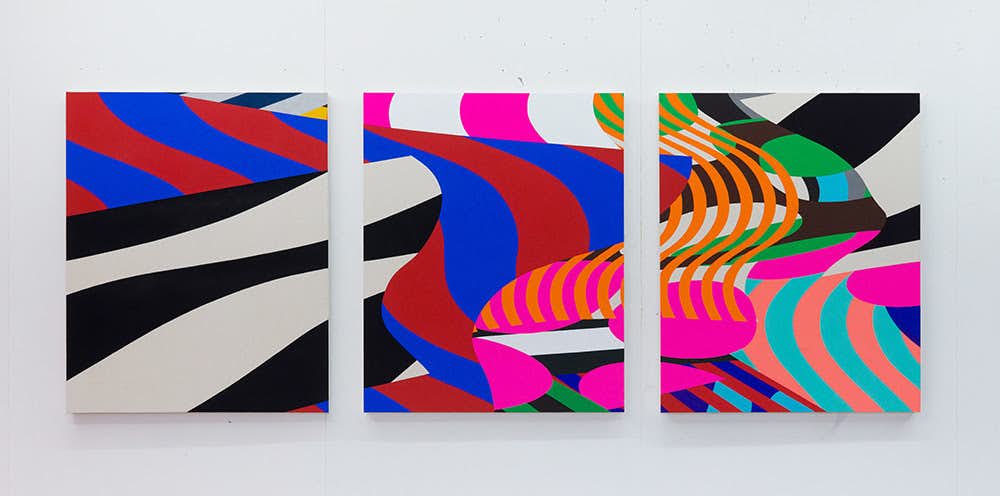 2012年から継続している「フラッグ」シリーズは、ストライプ状の形が揺らぎ、重なりあう造形の組み合わせからなり、画面の鮮やかな色彩は見る者に鮮烈なインパクトを与える。