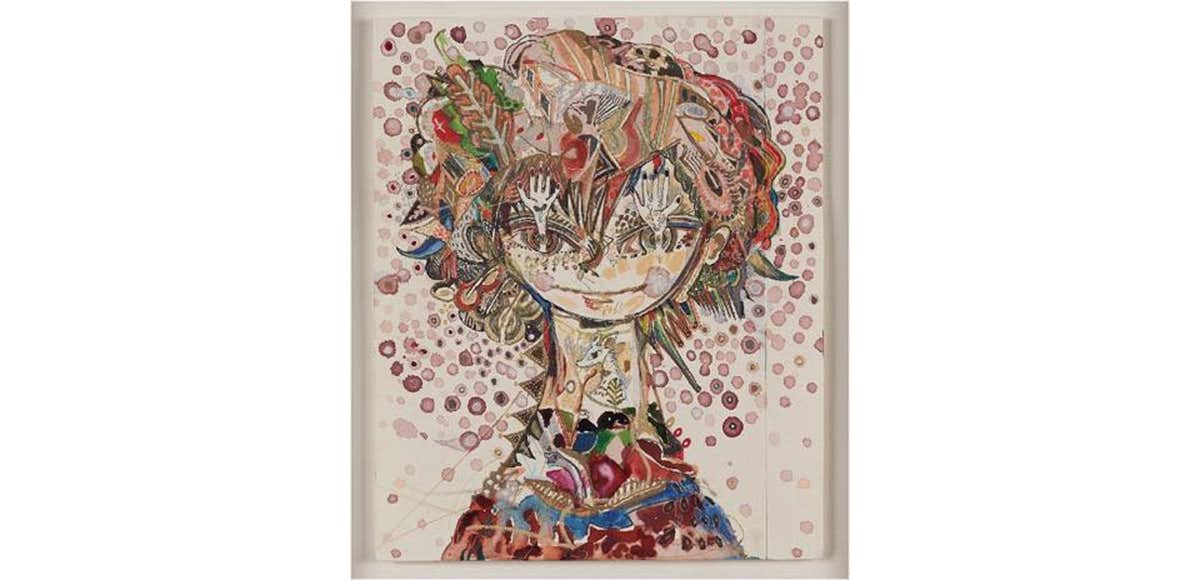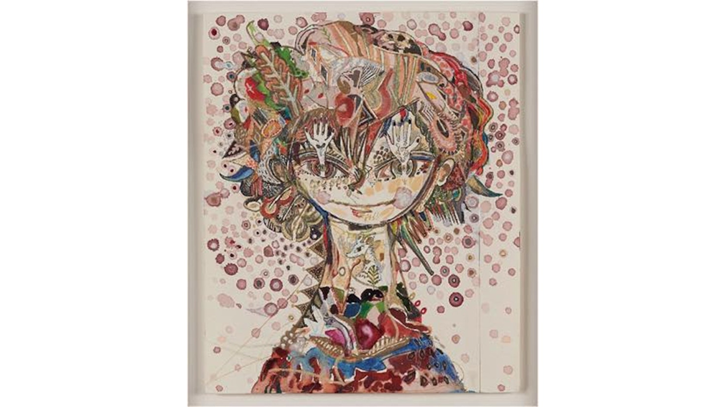 作品のモチーフとなるのは、植物、動物、人間、また動植物と人間のハイブリッドを思わせる神話的なイメージ。それらが画面に隙間なく併置され、大きな生き物のなかに入れ子状に小さな動植物が現れるなど、生態系の構造を表すかのように、細密さをもって描かれる。