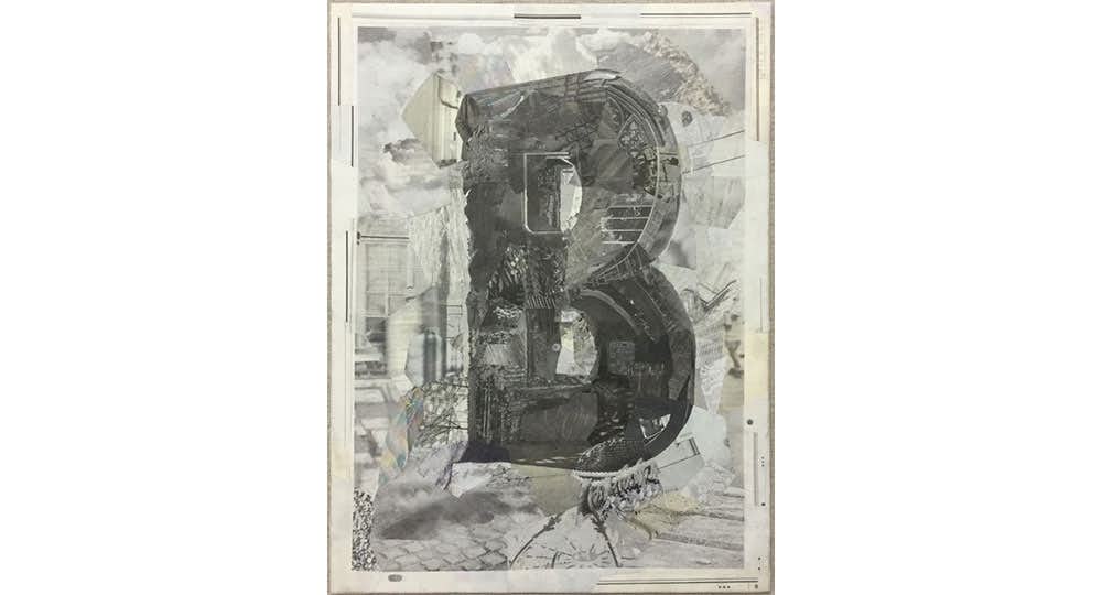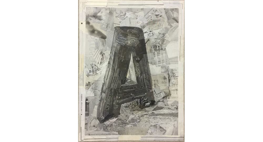 本展は、2つのシリーズ「…IS FOR…」「ページ」を中心に構成。「…IS FOR…」シリーズは、白黒の新聞写真からコラージュされた古風なプリント、ピラネージが描いた遺跡、過去と未来の文明の「グランドツアー」の記録として現れ、「考古学」としてとらえた文字記号を、不特定な風景のなかで放棄された記念碑として提示する。