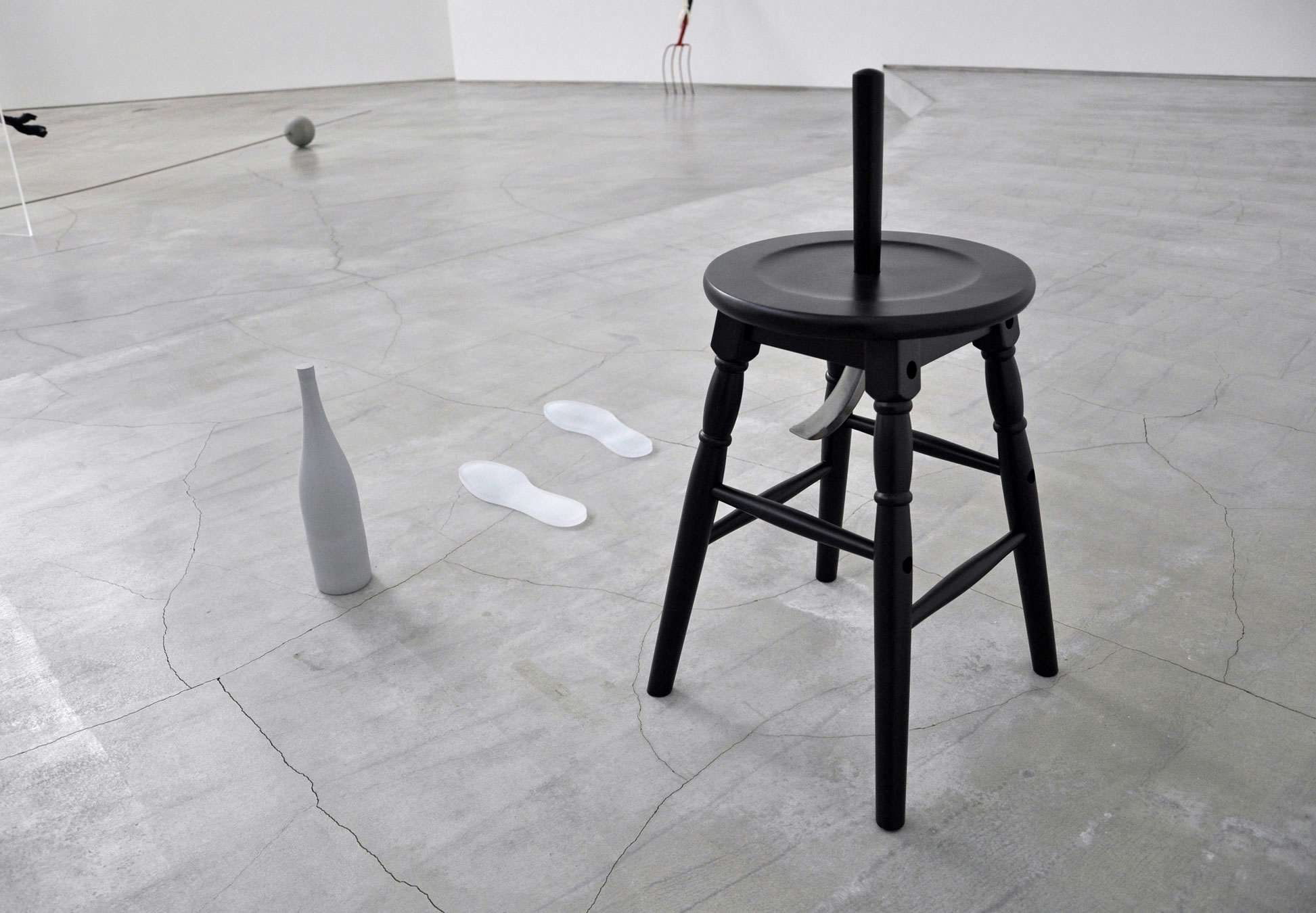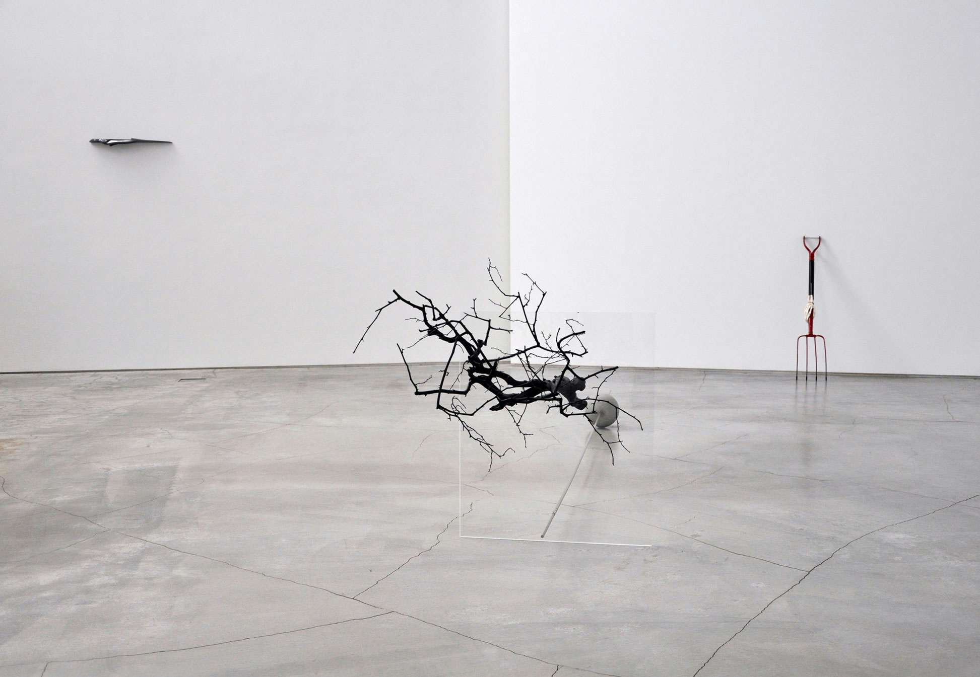 この思想を一貫して制作に取り組み、近年では、樹木や石、溶岩などの自然物を素材に、自然に対する問いかけを作品化。幾何学的な立体や鉄の棒が組み合わせられたオブジェのなかに、日よけや雨よけとして屋根につけられる庇(ひさし)に由来する作品《HISASHI》を配し、自然と人工という異なる領域がつながるような、「補遺の庭」という空間に立ち上がらせる。