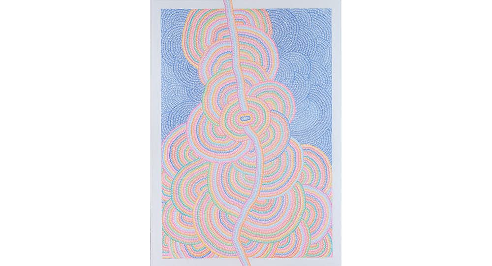 西脇は1977年大阪府生まれ。ボールペンを使い、全体を一見すると抽象絵画のような作品を制作。作品に近づいて見ると、一匹一匹の表情の異なる猫や網目といった限定的なモチーフの反復からなる緻密な描画によって構成されていることがわかる。