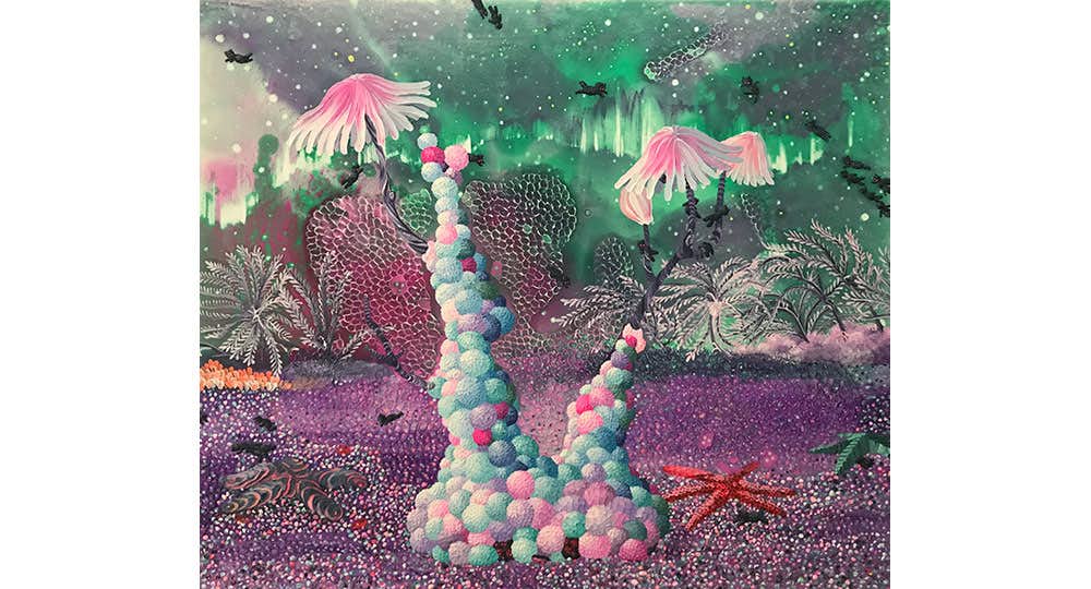 本展では、1年間のインドネシア滞在で制作した新作の油画、水彩画、立体作品を展示。南国の植物、海の生き物、珊瑚やジョグジャカルタの街中に描かれたグラフィティをモチーフに、「矛盾、相反するものを受け入れる」をテーマとした独特の世界観を表現する。