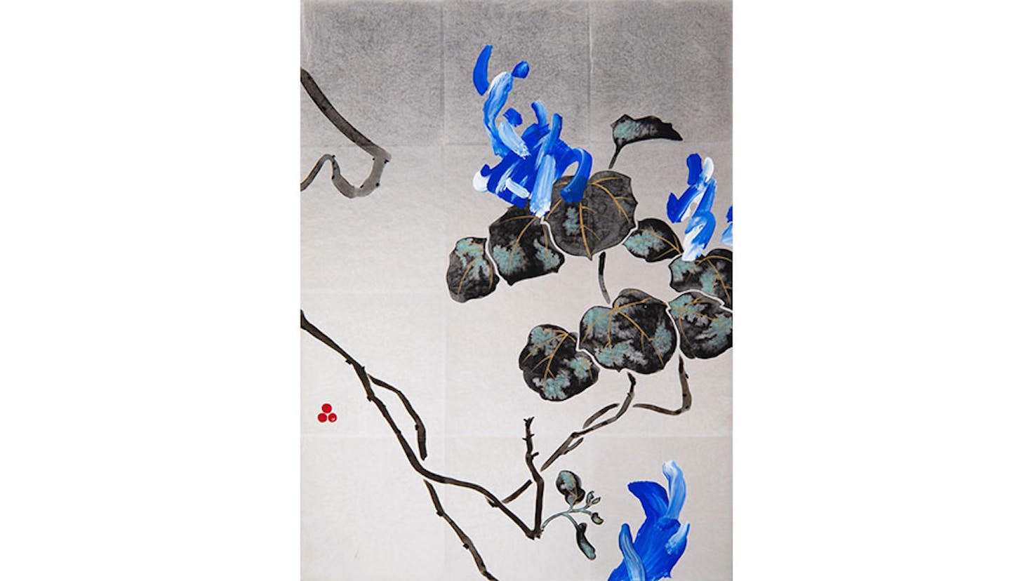 大胆な筆跡で描かれた花は、水墨画や書に見られる筆致と、抽象表現主義以降、現代絵画に多く見られるブラシストロークを取り入れることで、日本の絵画のアップデートを試行。また植物の花の部分のみを単純化して描写した作品は、日本独特の「型」に置き換える行為に基づいており、中国から伝わった漢字を単純化した「ひらがな」から着想を得た制作方法で描かれている。