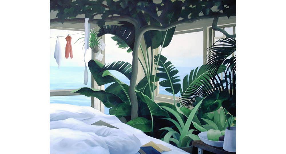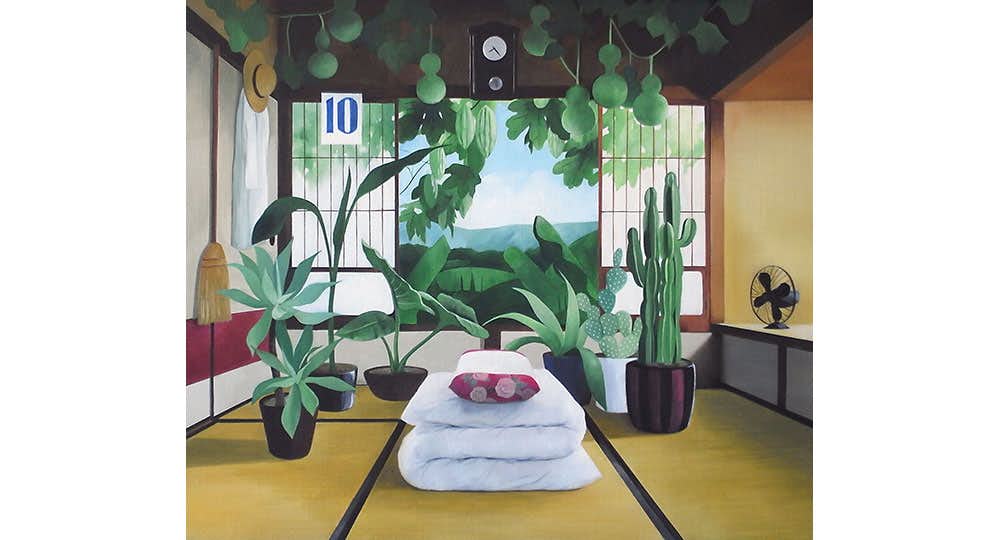 小さな家と動物や南国の植物、布団のある和室の室内から見える生い茂った植物。自身の生活や旅先ではあたり前に存在するものの組み合わせを平面的に描写した作品は、背景や建物、植物、動物などすべてが主張することなく、集まったものが醸し出す空気を感じ取ることができる。