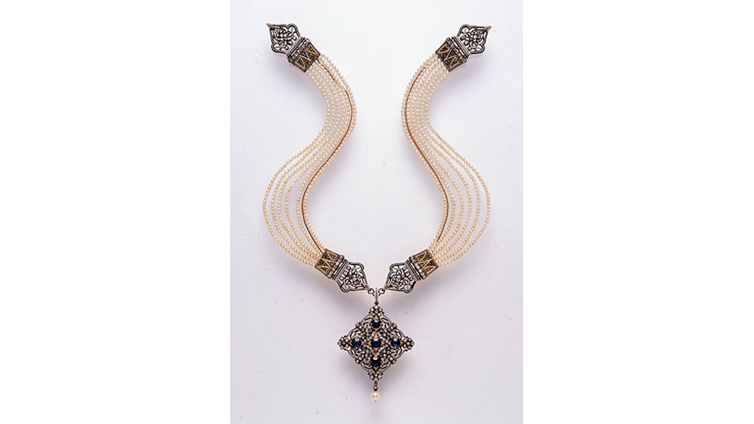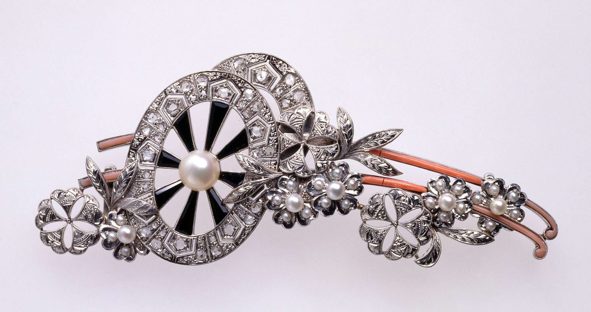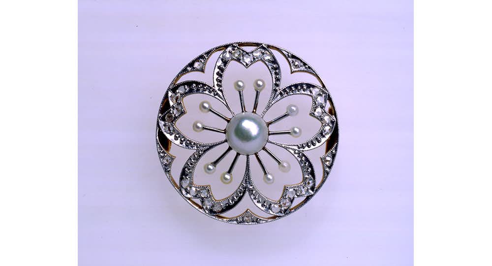 いっぽう日本では、1893(明治26)年に御木本幸吉(1858〜1954)が世界で初めて真珠の養殖に成功した後、今日に至るまで日本における真珠の養殖は発展し続けてきた。明治以前の日本では真珠が装身具として用いられることはほとんどなく、養殖真珠産業が興った後には、高度な金属細工技法による美しい装身具が製作されるようになっていった。