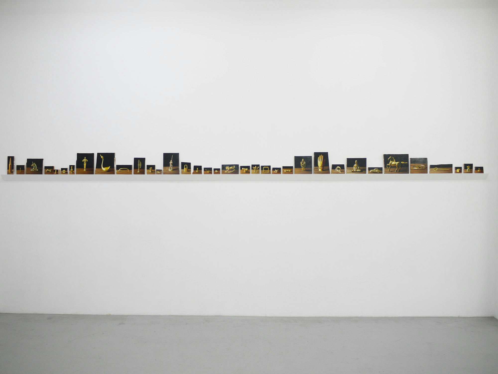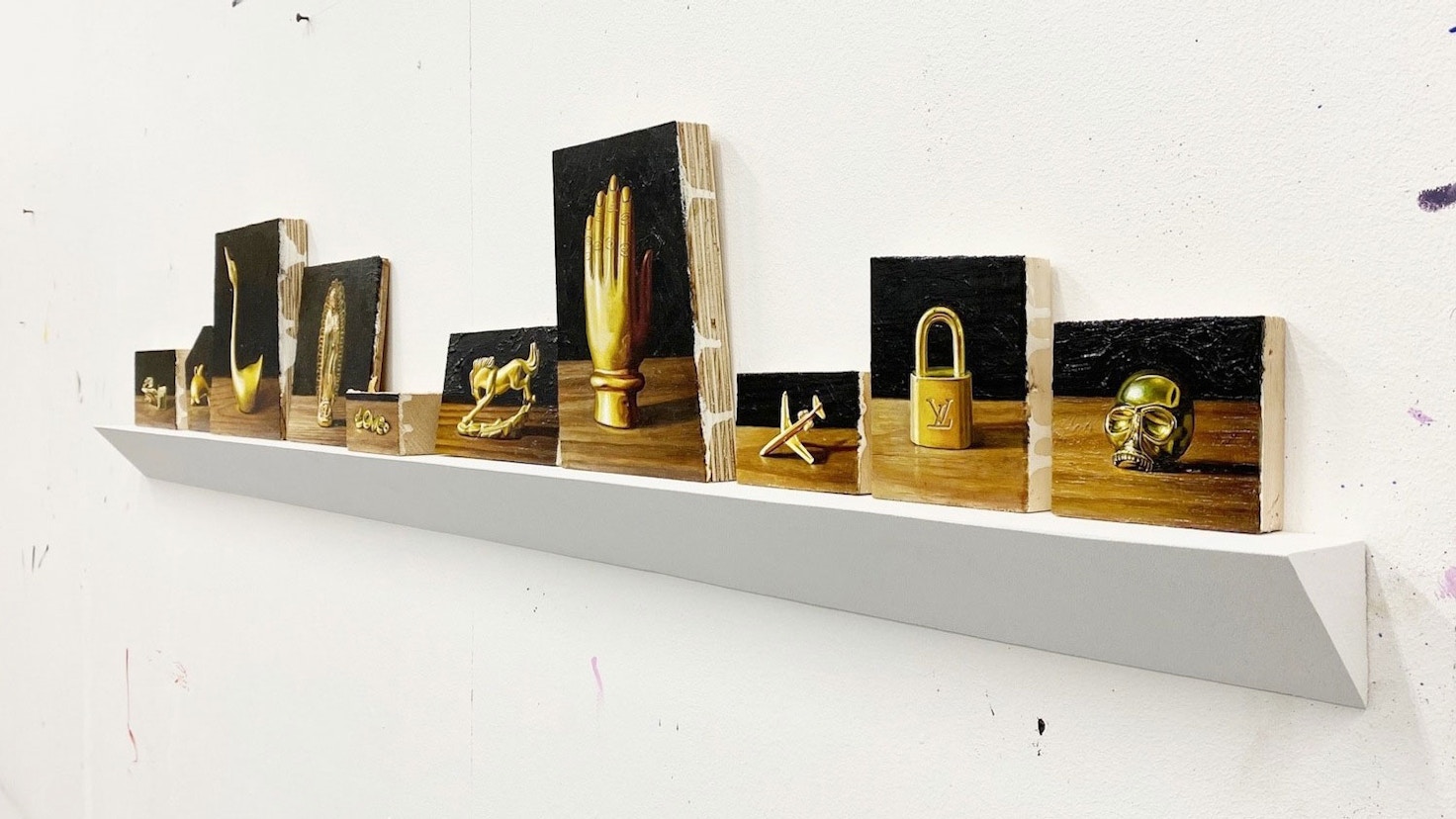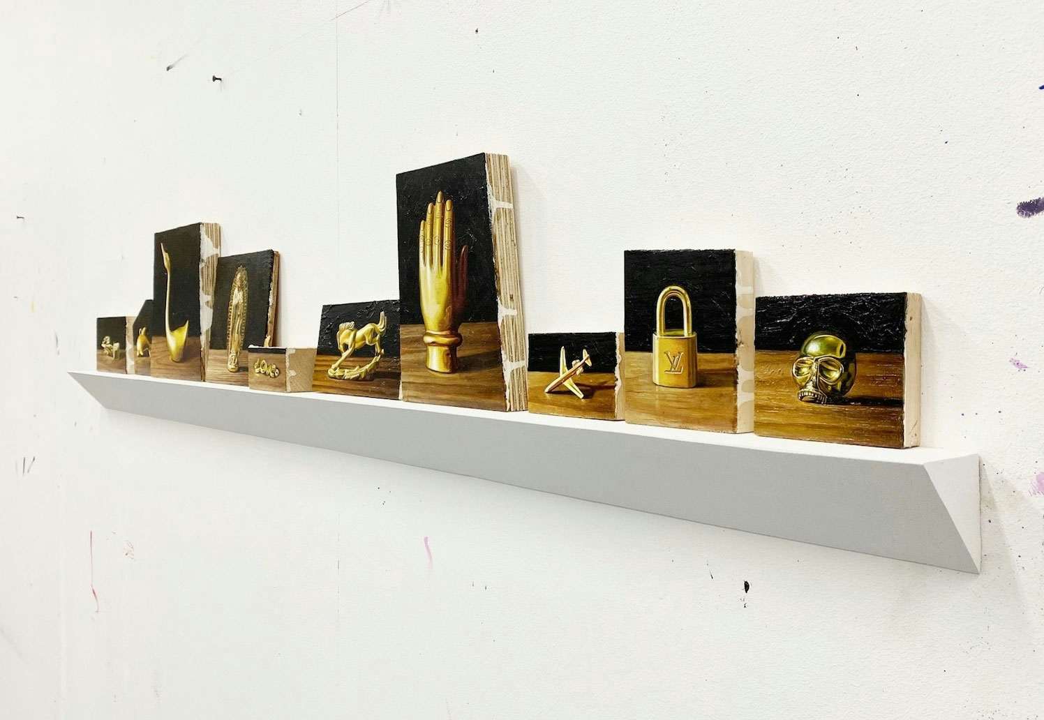 新作の「Golden Objects」は、作家自身が様々な場所で手に入れた置物やアクセサリー、金属の部品などの金色のオブジェを、制作や搬入など作業過程で出た木の切れ端の荒い表面上に描いたシリーズ。新作約70点を棚の上に併置し、これまで制作してきた「最初の物体」「ネオン」のシリーズと同様、既存の価値観や意味づけをとらえ直すことを試みる。