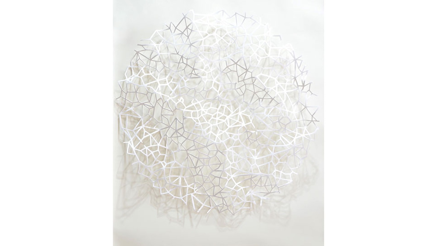 本展では、天体をモチーフに、星座と恒星をつないだ網状のレリーフ作品を展示。恣意的な事柄ではない風によって形態の隆起を決め、表面を磨く際の破損をそのままに、つながりと工程のなかでの出来事を痕跡とし、つなぐことと外側、因果関係と外側のような事柄について考える。